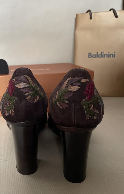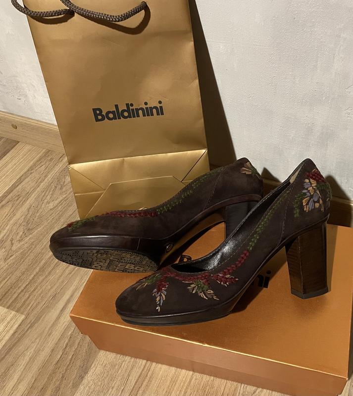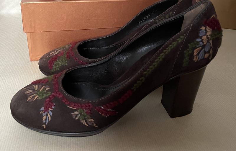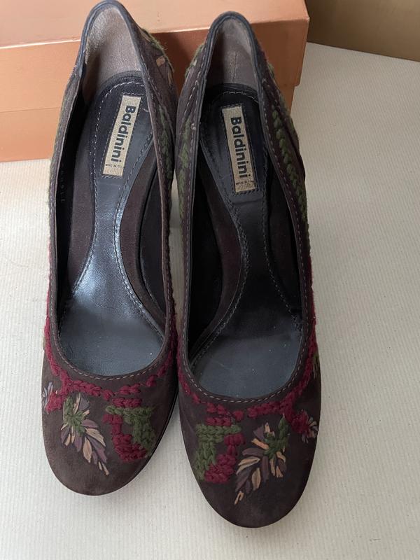 Італійські жіночі туфлі бренду Baldinini, оригінал в коробці, привезені з Європи. Коричневі, замш, вишивка. На розмір 39,5-40, підбор 8см, платформа 2см, устілка 25,5-26 см.
