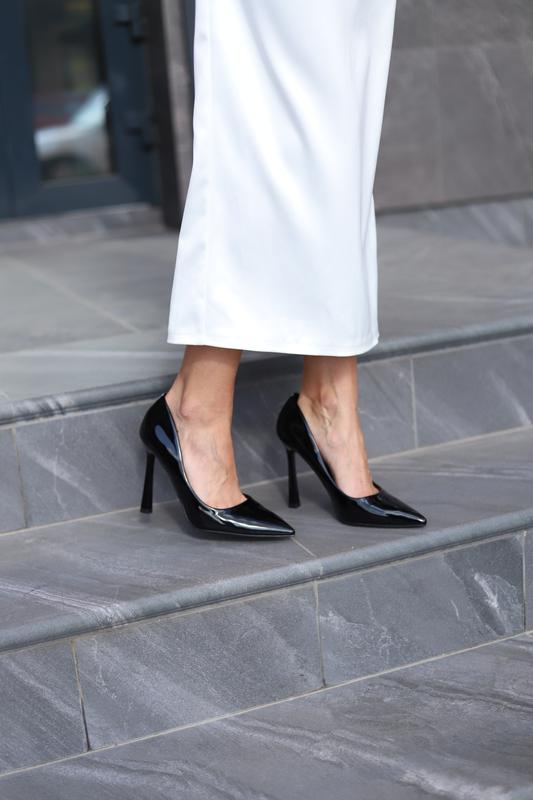 Туфлі у чорному кольорі з лакованої екологічної шкіри. Зручний і стійкий каблук 10 см. Розмір: 36, 38, 39, 40