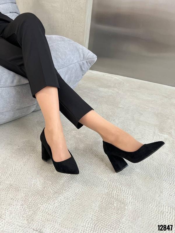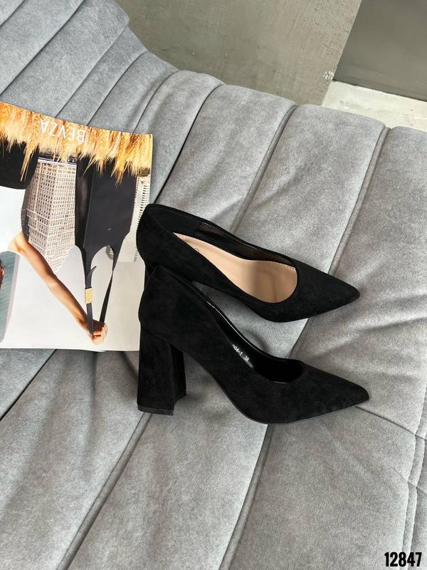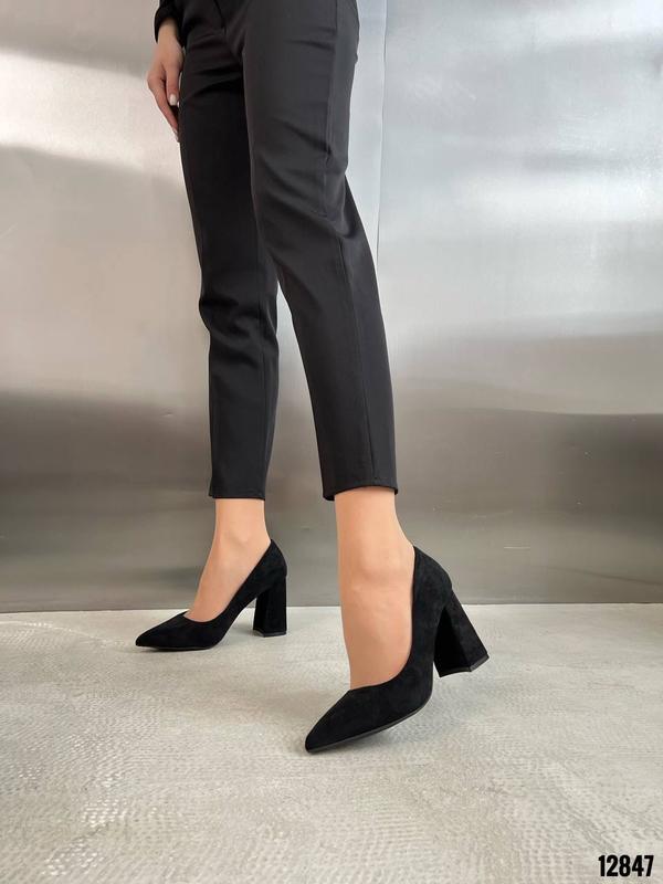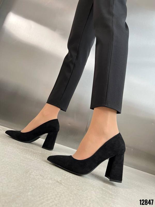Чорні замшеві туфлі човники на високих товстих підборах з гострим носом