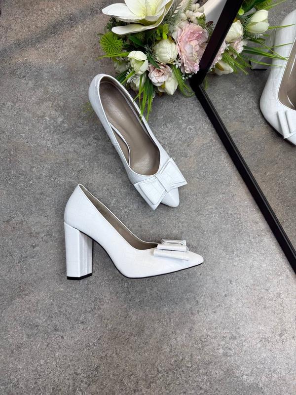 Туфлі з натуральної італійської шкіри з бантиком білі жіночі на каблуках