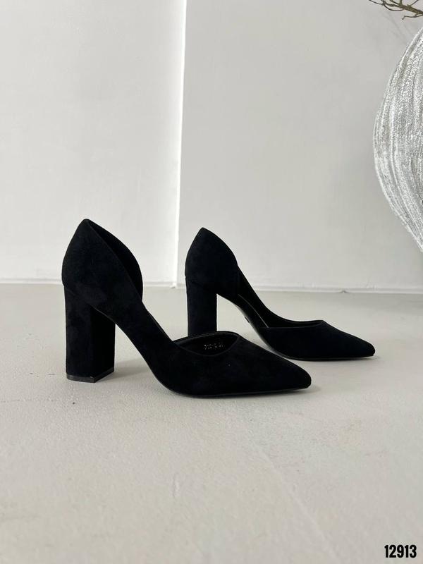 Чорні замшеві туфлі човники на високих товстих підборах з гострим носом