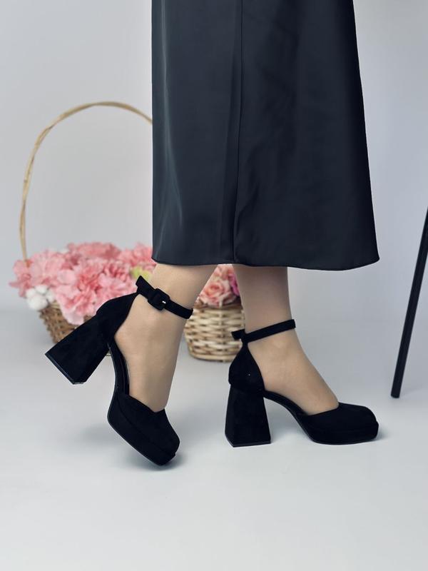 Жіночі чорні відкриті замшеві туфлі з еко замші з ремінцем на товстих високих підборах кв...