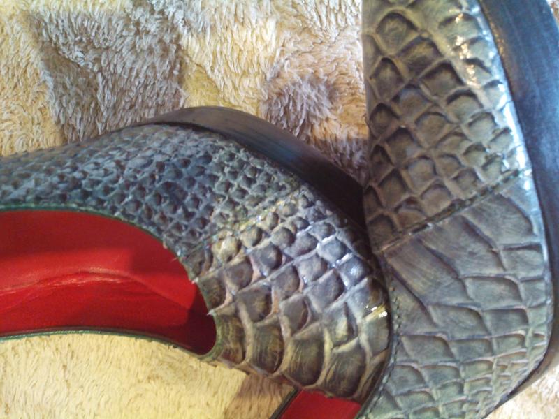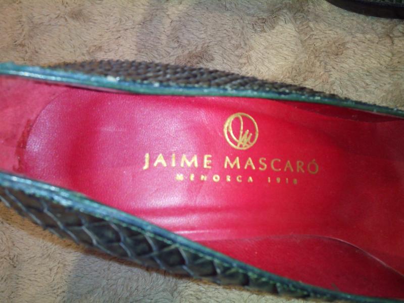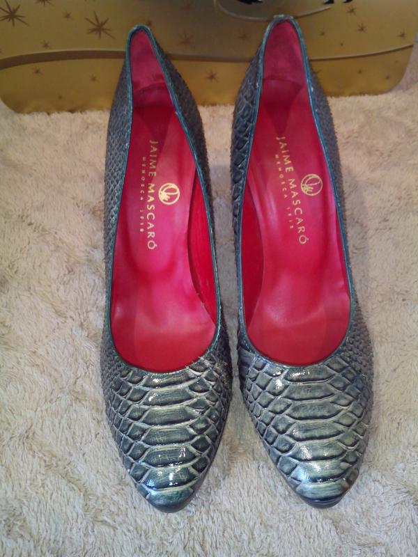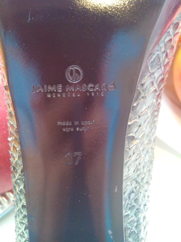 Туфлі зі зміїної шкіри БРЕНД JAIME MASCARO (ІСПАНІЯ). Іспанська преміальний бренд c 1918 року Один з найстаріших і заслужених модних брендів Jaime Mascaro з'явився на світ на початку минулого століття, в 1918 році. Засновником і власником бренду є Jaime Mascaro. В даний час штаб-квартира бренду знаходиться в місті Ferreries (Іспанія). Серед клієнтів бренду - Lily Allen, модель Клаудія Шиффер (Claudia Schiffer). Розмір вказано 37. Довжина устілки повна з носком - 25 см, ширина в районі кісточки-7,5. Каблук 10 см, перед платформа-1,5 див. Дорогий бренд. Шкіра змії, на фото видно лусочки.Колір темно зелений, хакі. Ідеальна якість. Зручна колодка. Бездоганно сидять на ніжці. Виглядають чудово і дорого. Були тільки в примірці. Коробки і пиляків немає.
