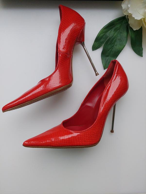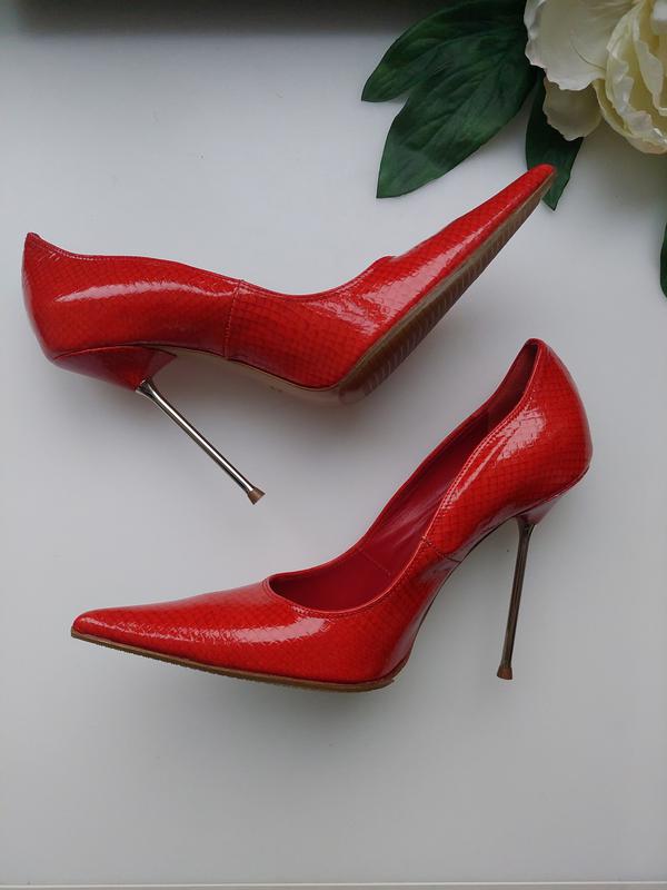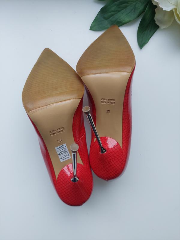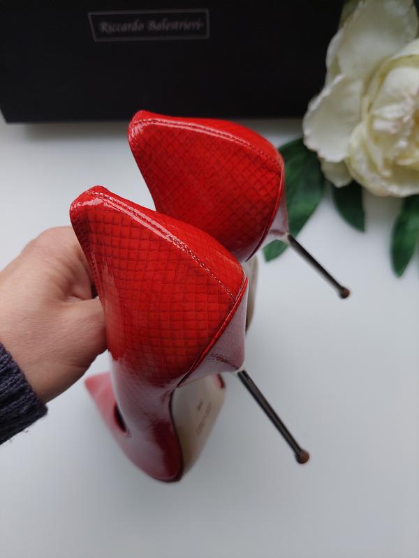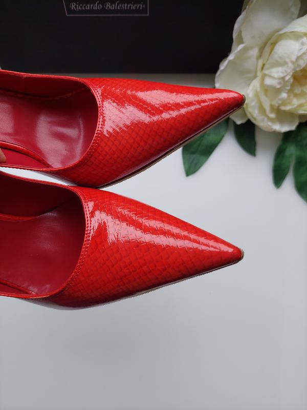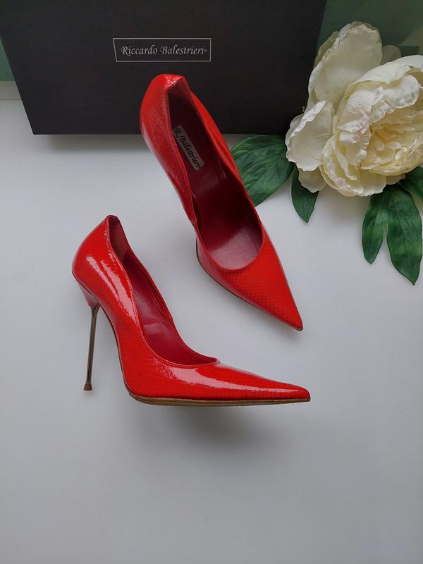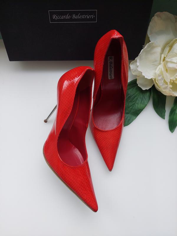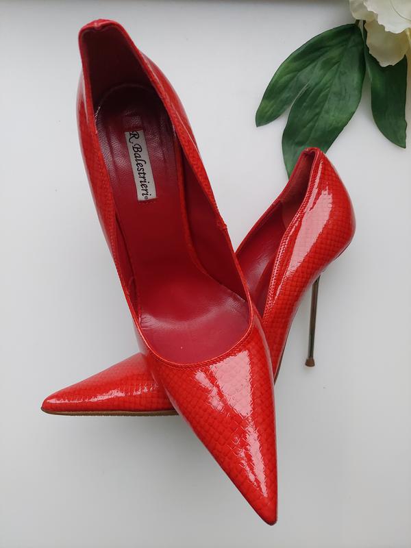 Туфлі-човники класичної форми виконані з 100% шкіри червоного кольору від R. Balestrieri . Гострий носок, тонка поліуретанова підошва доповнено високим металевим каблуком-шпилькою. Підкладка та устілка з гладкої шкіри. Розмір вказаний на 38. Підійде на 37-37,5 см 100% Стан нові❗❗🥰🥰🥰 З коробкою❗🛍 На всі питання дам відповідь 😉.