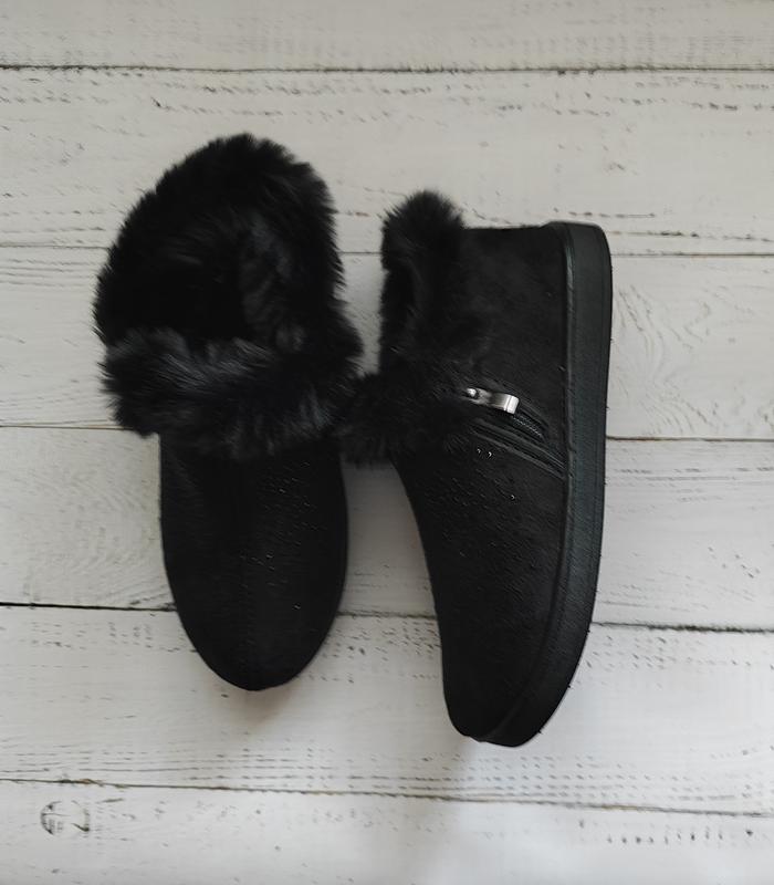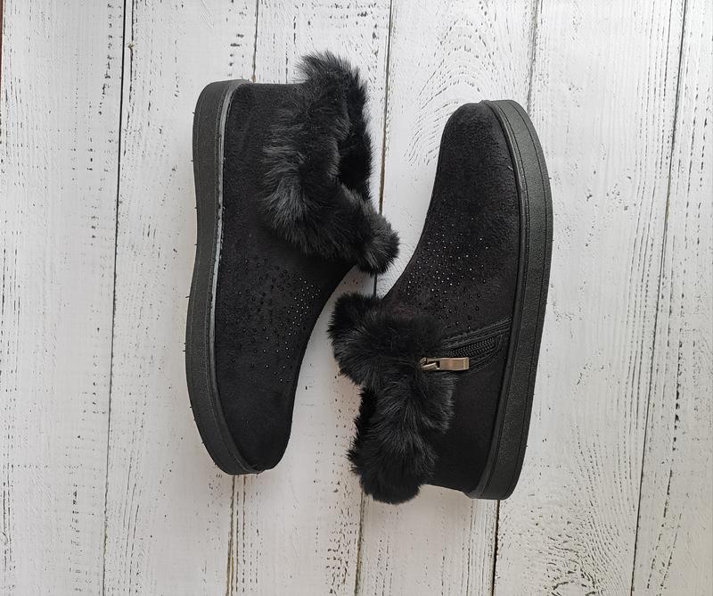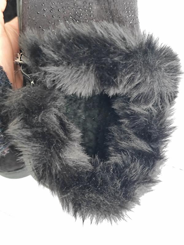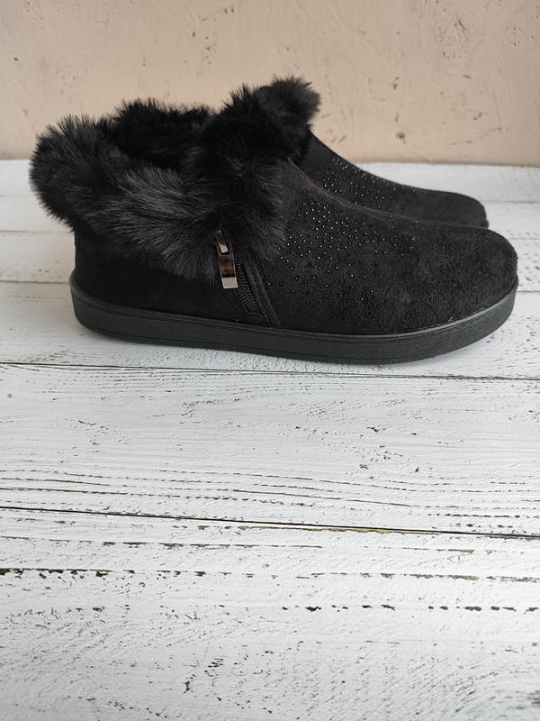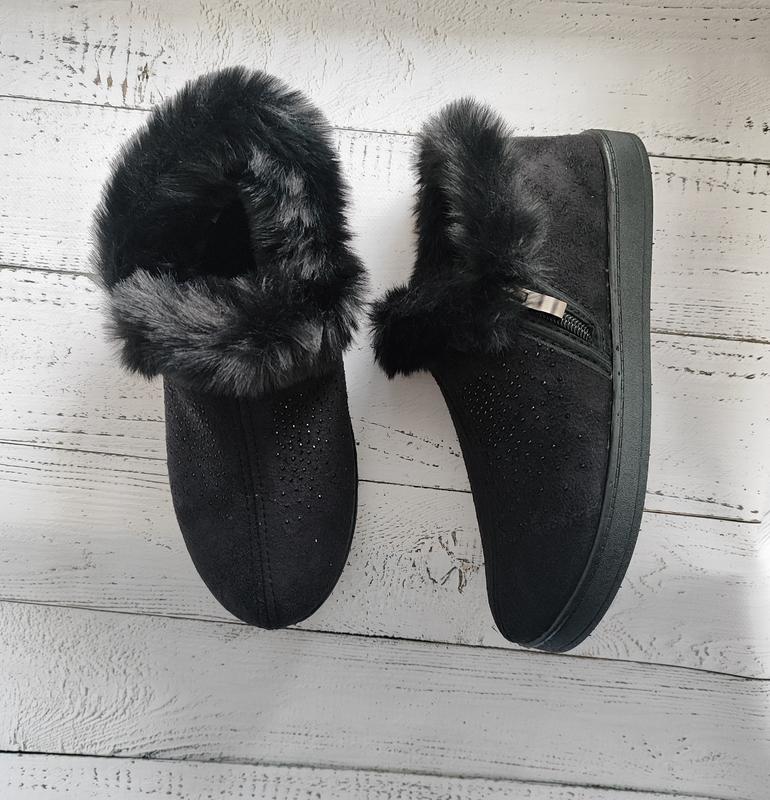 Підошва міцна, ходити в них можна як по вулиці, так і в приміщеннях, що слабо опалюються. Висота підошви 2-2,5 см. Верх штучна замша прикрашена стразами, усередині – штучне хутро. Застібається на блискавку збоку. Дуже теплі, м'які та затишні.