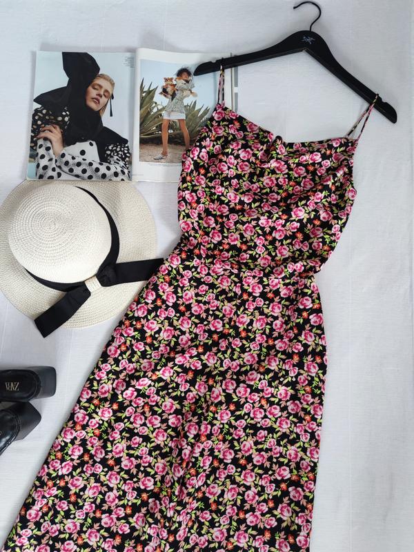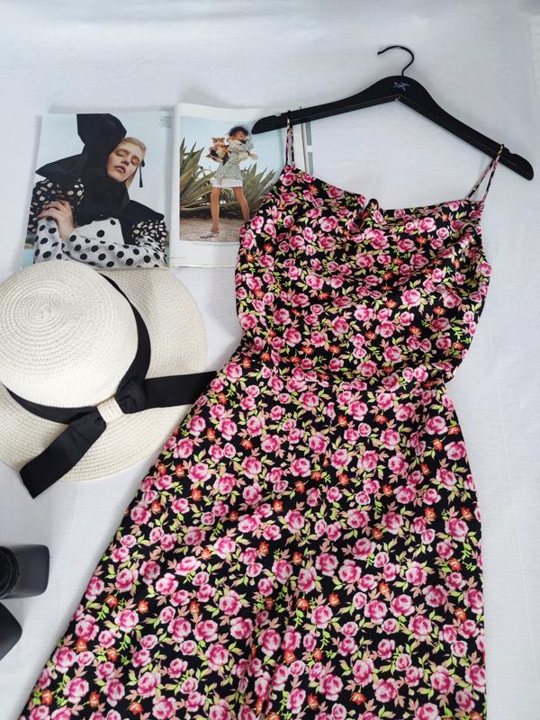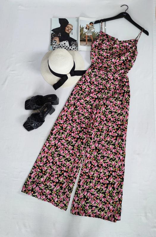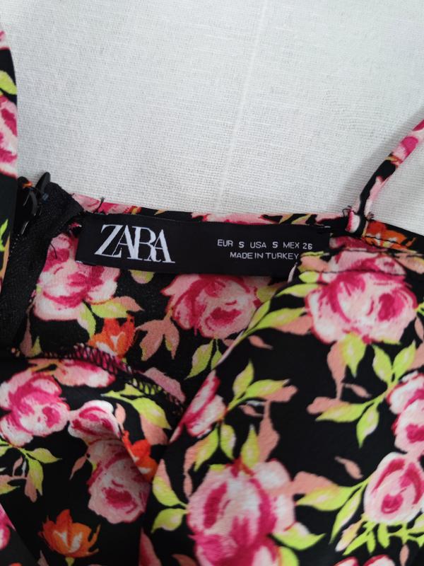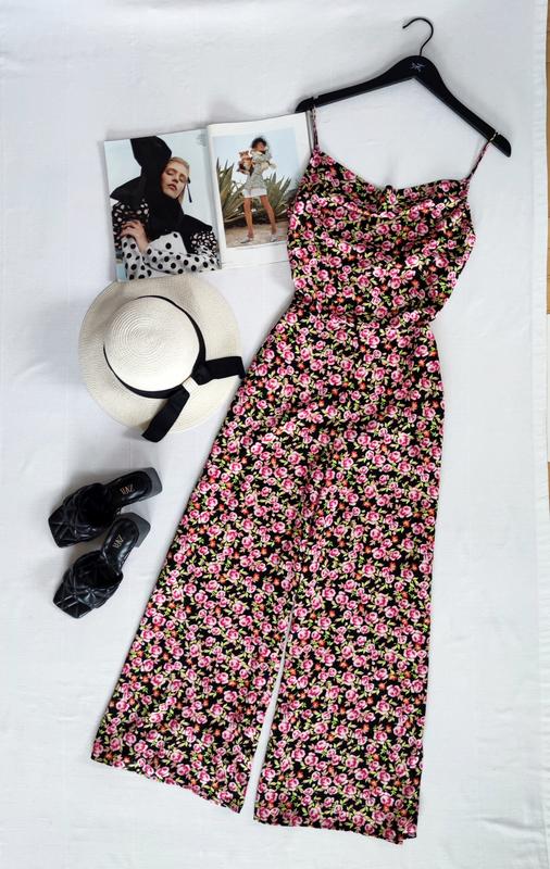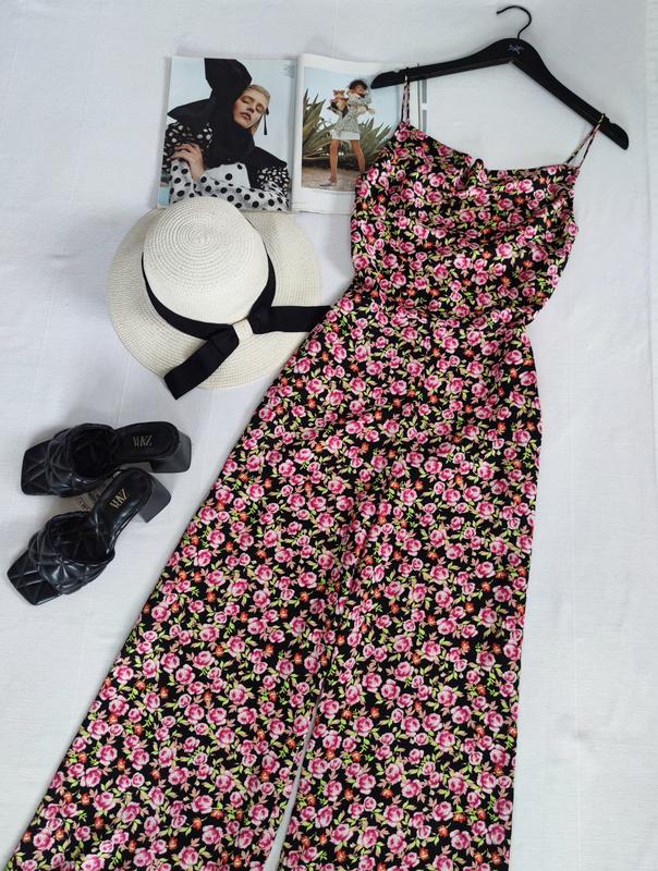 🌿сатиновий комбінезон з квітковим принтом від Zara, збоку на замкуРозмір:SЗаміри:ПО грудей 44 см, ширина поясу 34 см, ПО бедер 53 см, довжина 140 см