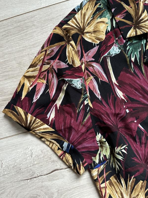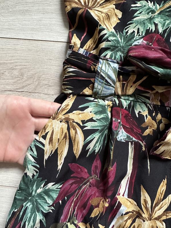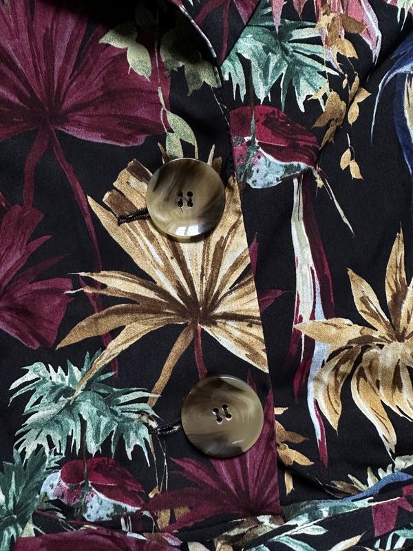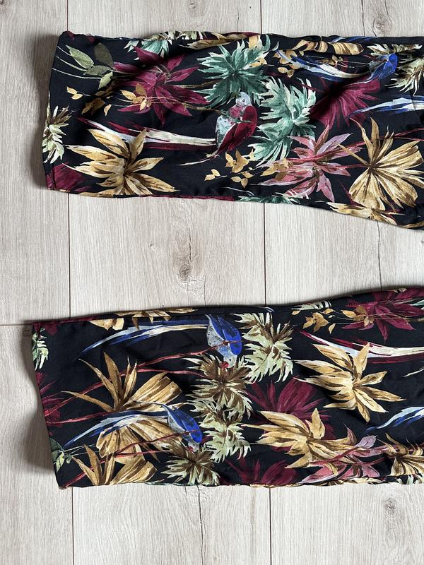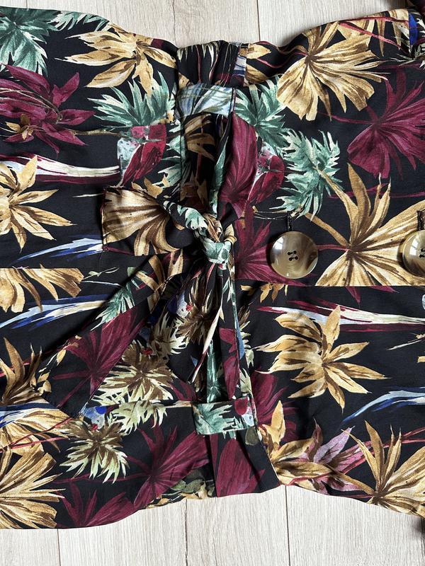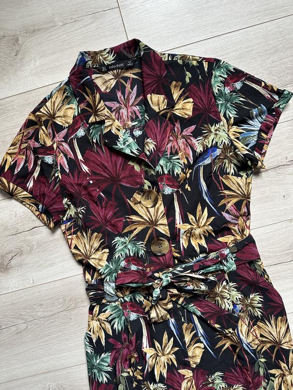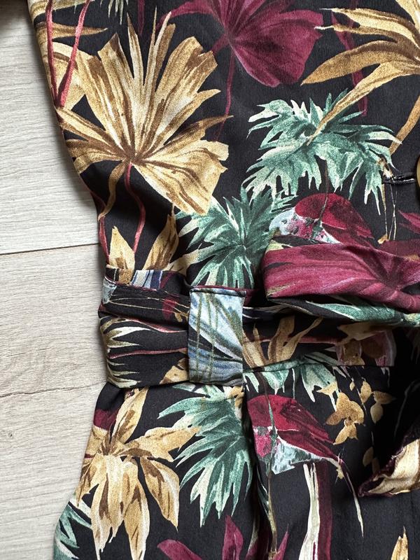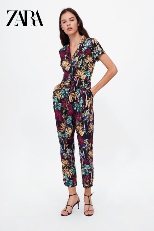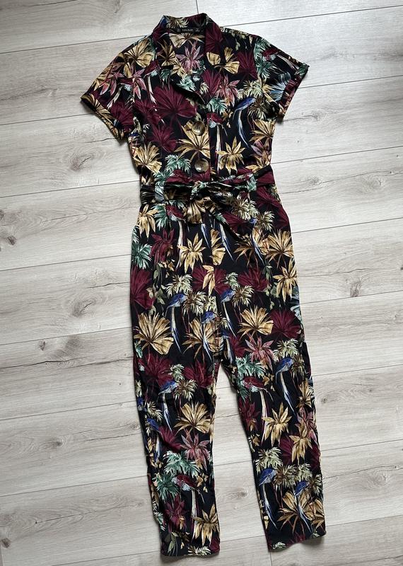 Комбінезон із тропічним принтом. Струманий комбінезон із коміром із лацканами та короткими рукавами з закотами. Тканинний ремінь у тон на талії, складки на штанах спереду, бічні кишені, застібка на блискавку та ґудзик спереду. 100% полиэстер