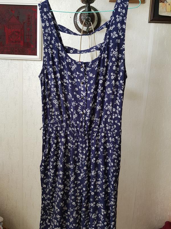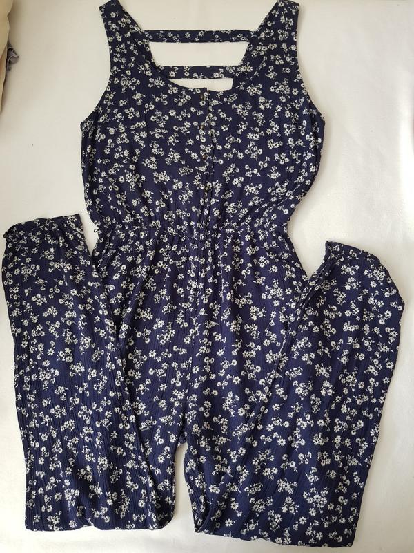 Легкий комбінезон з натуральної тканини в дуже доброму стані, обхват грудей 100 см, обхват талії 70-108см (резинка ), обхват бедер 106см, довжина ліфа 47см, шаг 75см, довжина штанів 106 см, по боках є кармани, застібка спереду на ґудзики тканина жатка, трохи розтягується.