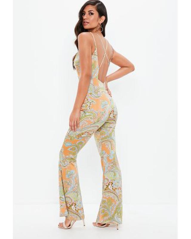 Шикарний комбінезон з відкритою спиною і брюками-кльош у принт пейслі missguided