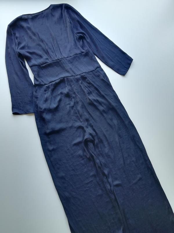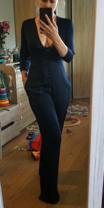 Темно-синій брючний комбез, вартий червоної доріжки)) Глибоке декольте, спереду застібається на гудзики, збоку - потаємне блискавка. відрізний по талії, рукав 3/4. Є кишені. Тканина легесенька, наче шовк, не просвічується. Колір дуже благородний.