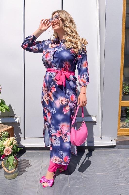 воротник стойка и рукава с патиками, впереди планка с пуговицами, посадка брюк высокая и по бокам карманы, пояс впереди ровный и сзади на резинке,