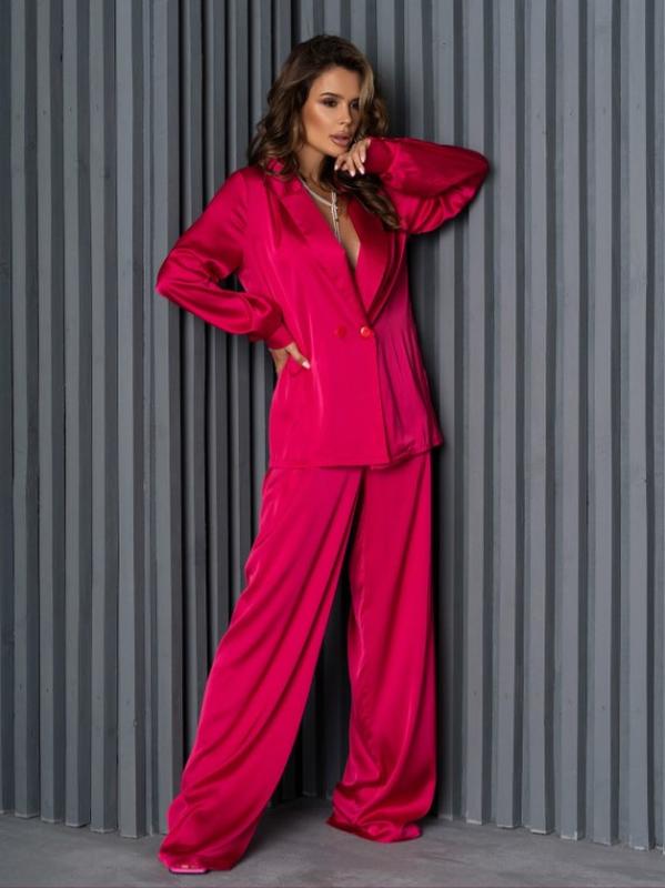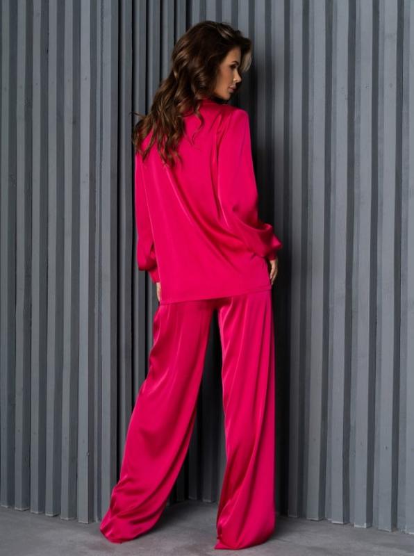 Свободный костюм из шелка с пиджаком-рубашкой. Модель прямого кроя с длинными рукавами на манжетах и классическим воротником. Застегивается на пуговицу, без подклада. Брюки прямого широкого кроя с поясной резинкой и высокой посадкой.