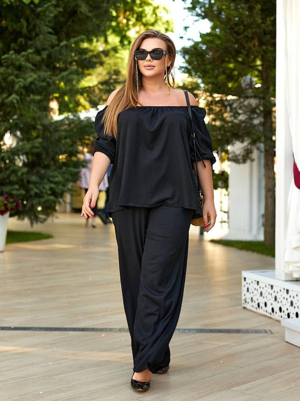 48-52. ОГ - 130см, довжина блузи по спинці 52см. ОС - 120 см, довжина брюк - 107 см