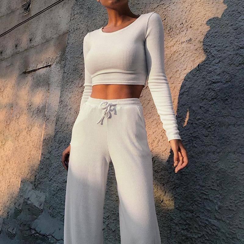 Костюм складається з широких штанів палаццо з високою посадкою та кроп топа з довгим рукавом.