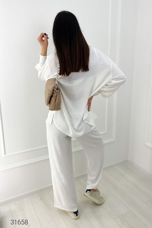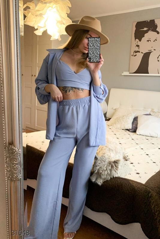 42-48 (ОГ-118, топ: довжина від плечового шва 37, об'єм лямки топа (шпульна гумка) 66-71; брюки: ОТ 66-71, ОБ-100), довжина: сорочка-71, рукав по внутр. шву-51, топ-37, брюки по зовн. шву-107/ по внутр.-76 см.