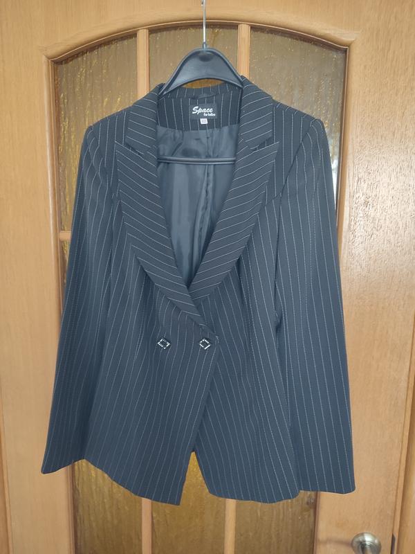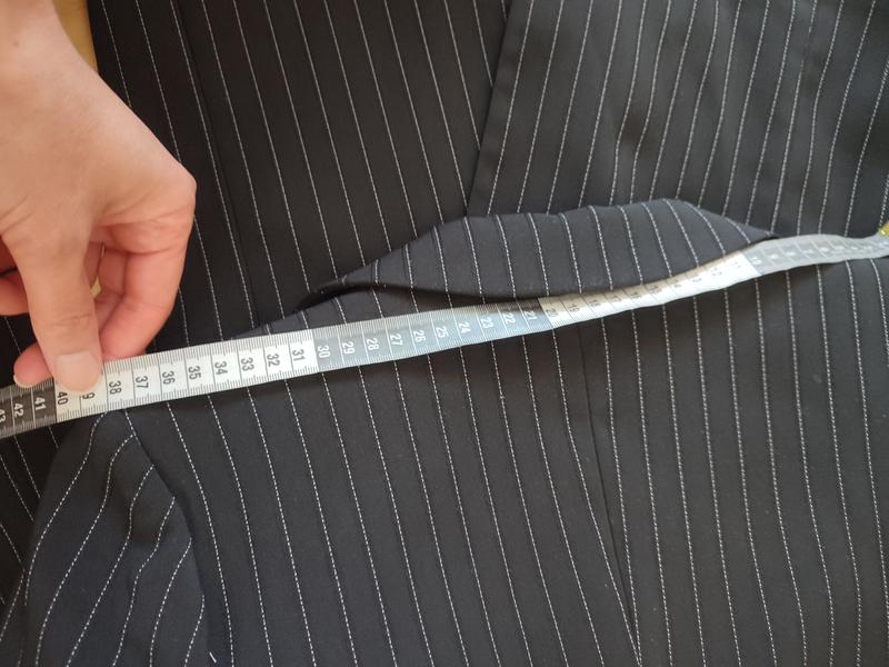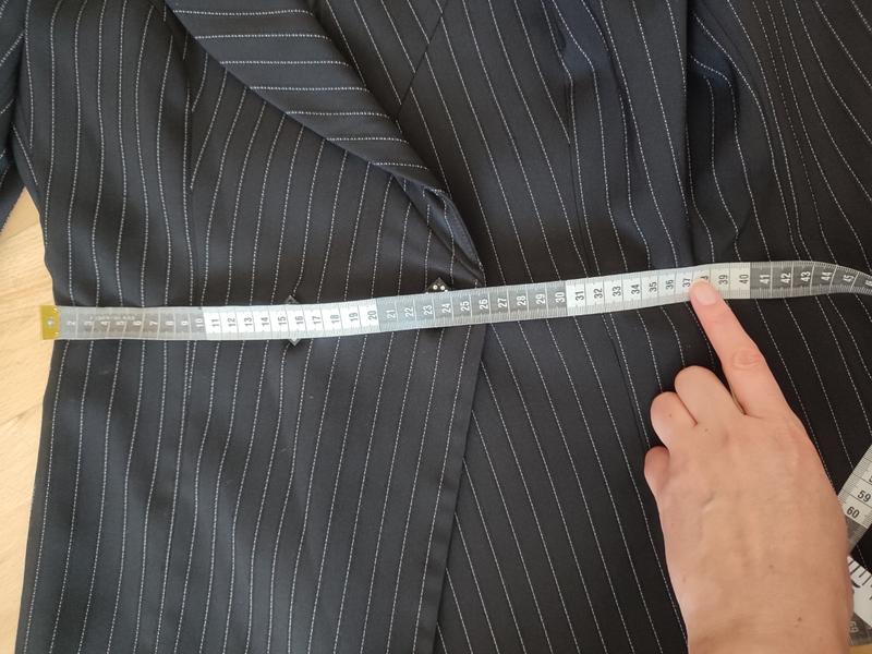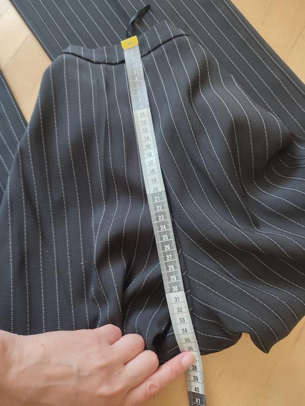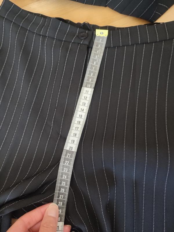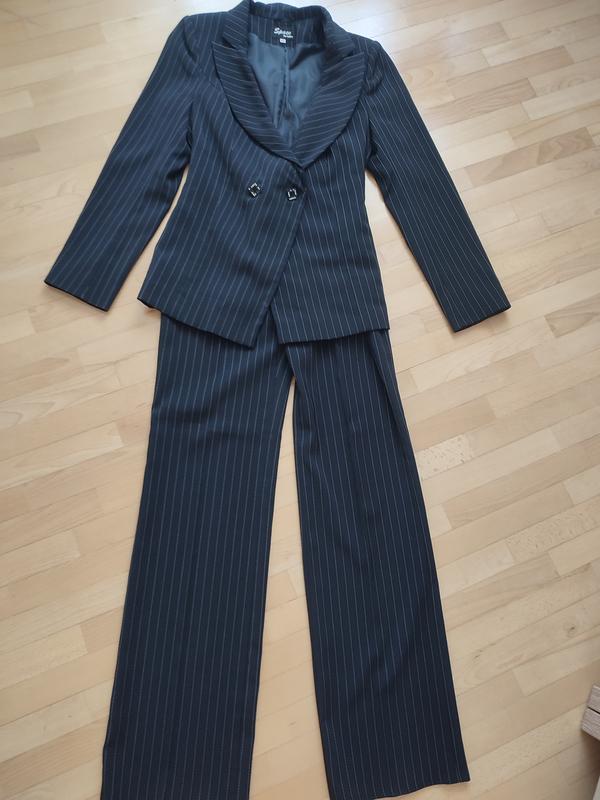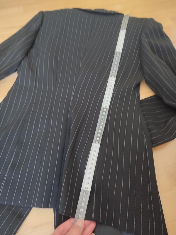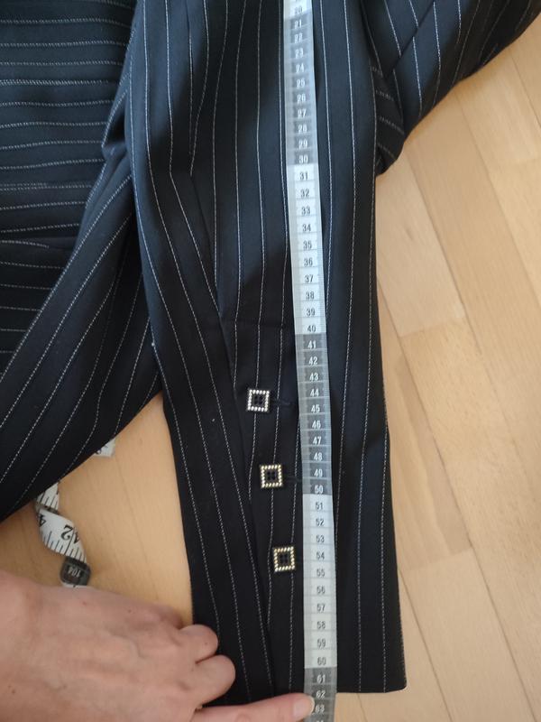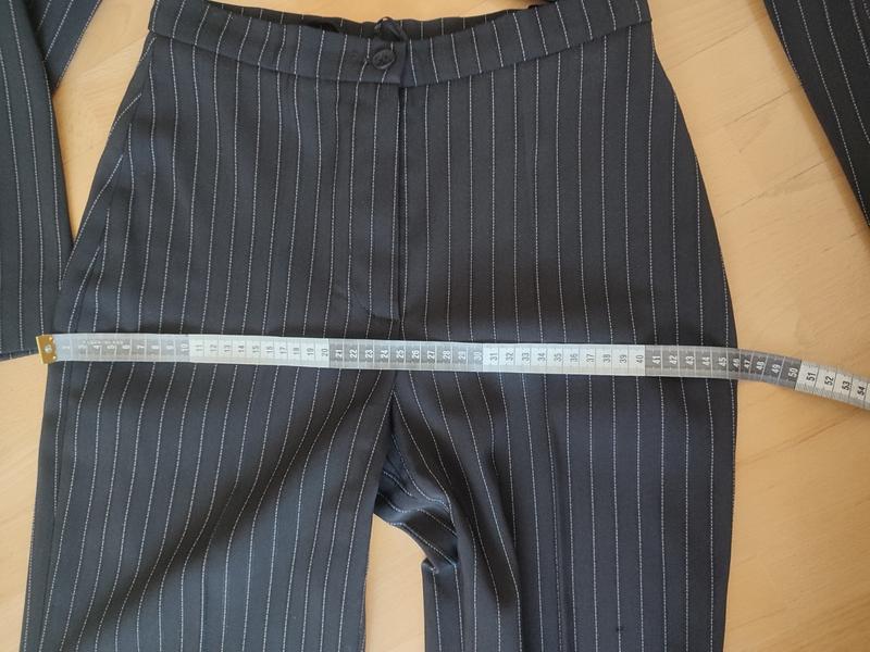 Костюм у смужку- штани та піджак на підкладці. Колір дуже темно синій майже чорний. Тканина не мнеться. Треба тільки гудзики замінити так, як на них випали пару камінчиків. Дефектів немає. Всі заміри на фото.