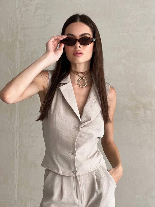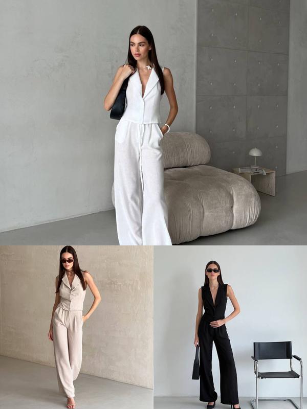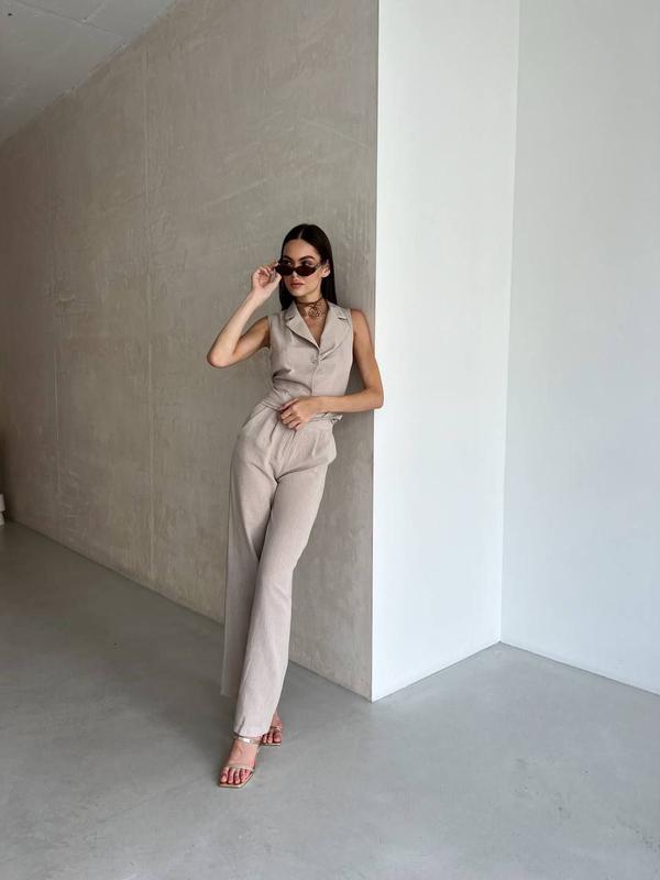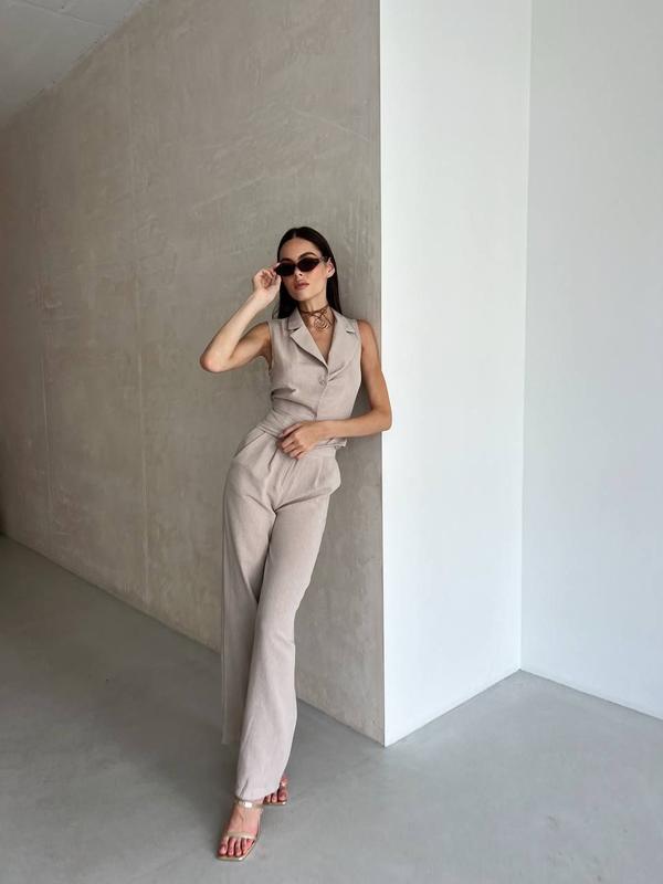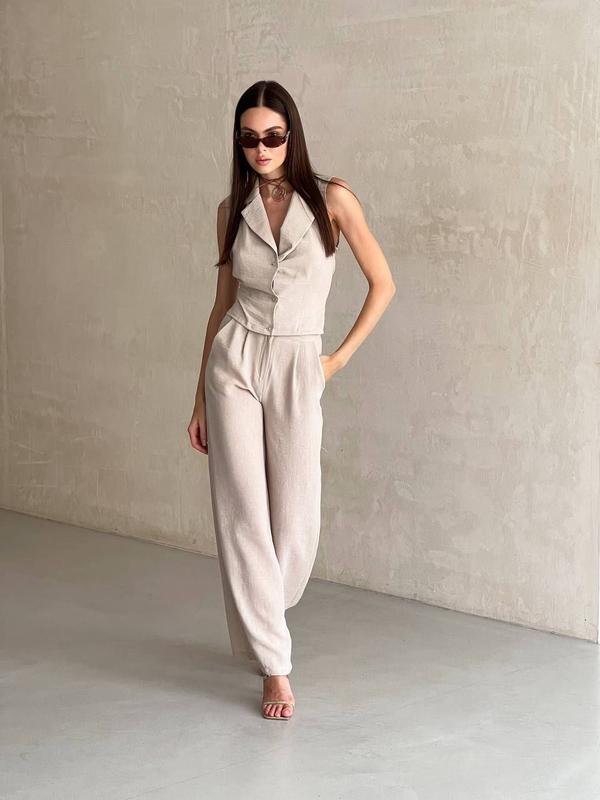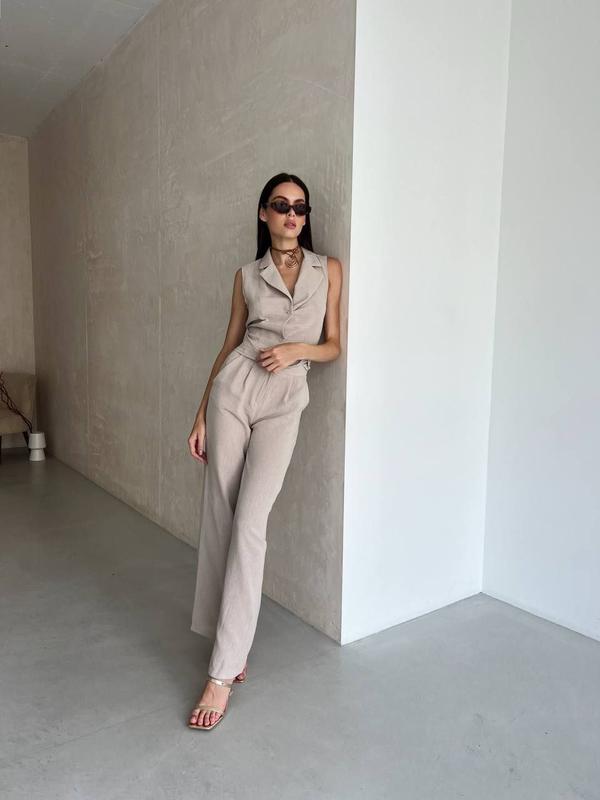 Костюм з натуральної ткани з укороченим жилетом і брюками палаццо, жилет ззаді затягується і розмір регулюється, брюки також з затяжкою і кишенями
