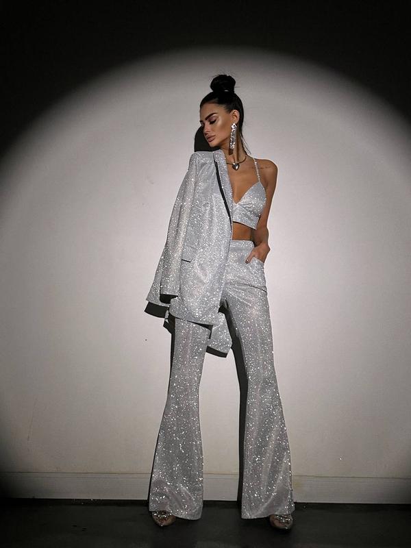 Костюм: піджак на підкладці, штани кльош+ топ з чашечками ▫️ ціна 1870 грн ▫️тканина: люрекс ▫️розмір: XS, S та М ( L + 200 грн)