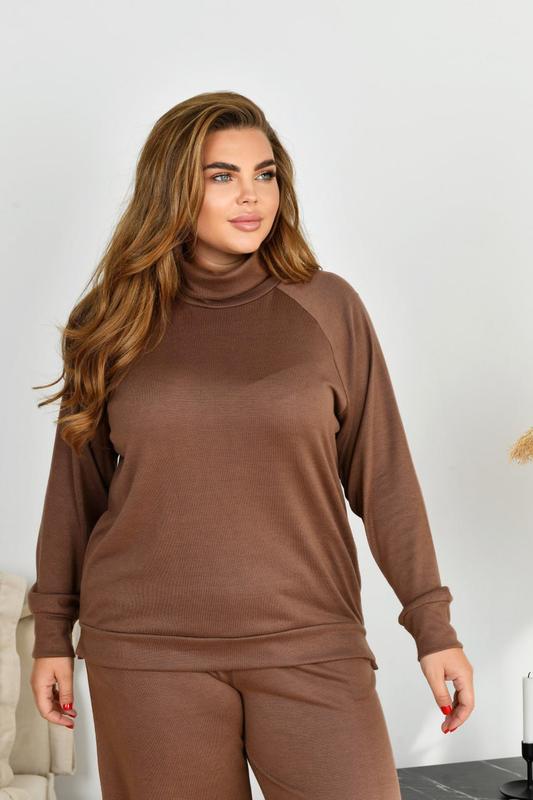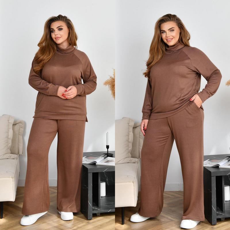 Неймовірно стильний і водночас зручний повсякденний костюм: туніка + брюки-палаццо, виконаний із трикотажу-вʼязки (розтяжність середня). Туніка прямого вільного силуету. Горловина висока, лінія плеча спущена, рукав на манжеті. Знизу з боків невеликі розрізи. Кишень та застібок немає. Брюки широкі, прямі, по талії зібрані на резинку. В бічних швах оброблені кишені.