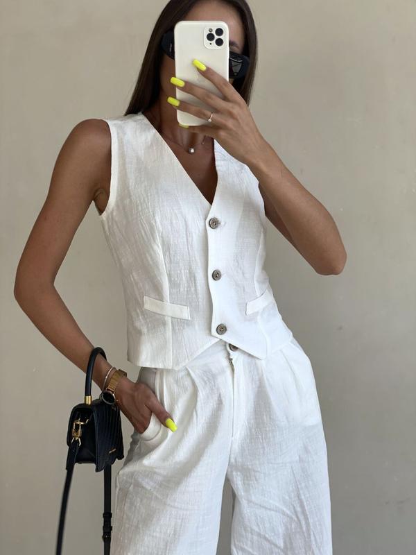 Базовий костюм-двійка натуральний льон (жилетка + штани палаццо) штани із високою посадкою