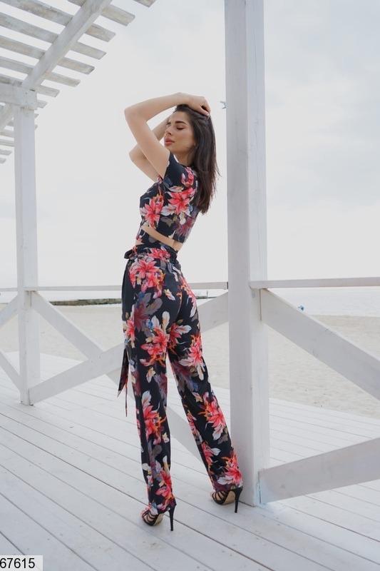 42-44,46-48 Колір: чорний Тканина: турецький супер-софт Довжина від плеча - 112 см Додаткова інформація: штани - висока посадка і з кишенями, топ на запах і на зав'язках, Сезон: літо Виробництво: Україна