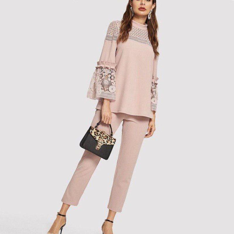 Жіночий рожевий повсякденний костюм з мереживною вставкою і брюками до щиколотки