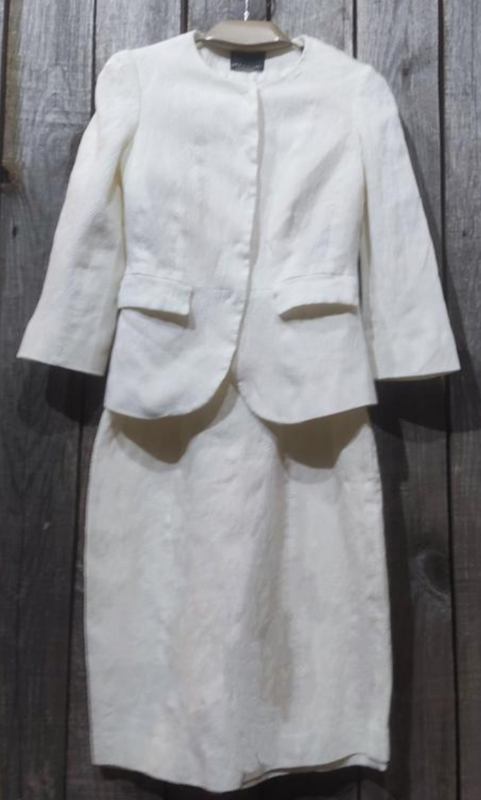 італійський костюм в білому кольорі з цупкого еластичной тканини.факьуная. сукня футляр та вкорочений жакет.сьан чудовий. розмір на ХС С. ціни для прикладу