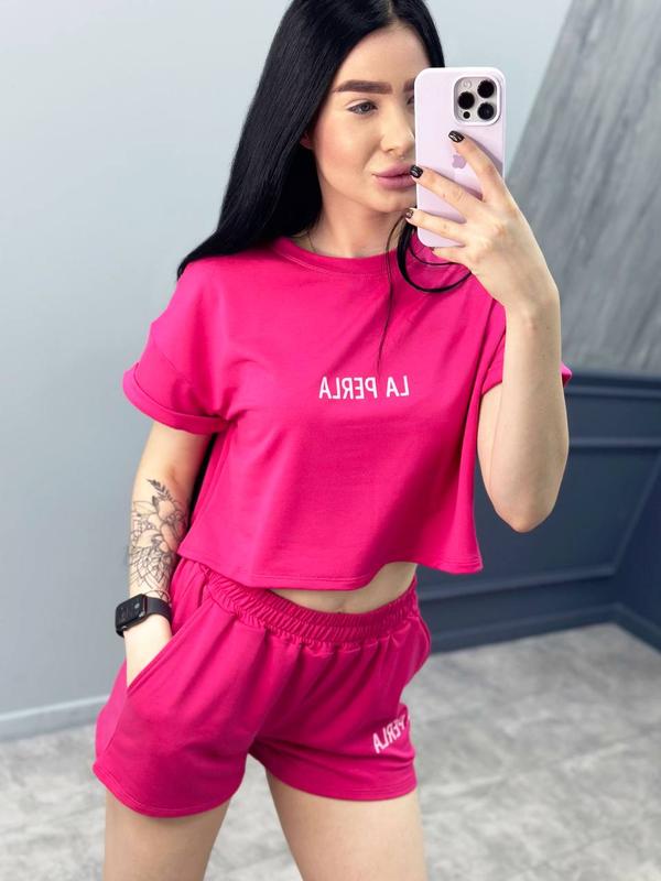 2.Короткі шорти з кишенями. Пояс на широкій еластичною гумці, посадка висока. Збоку на шортах є така ж накатка, що й на футболці.