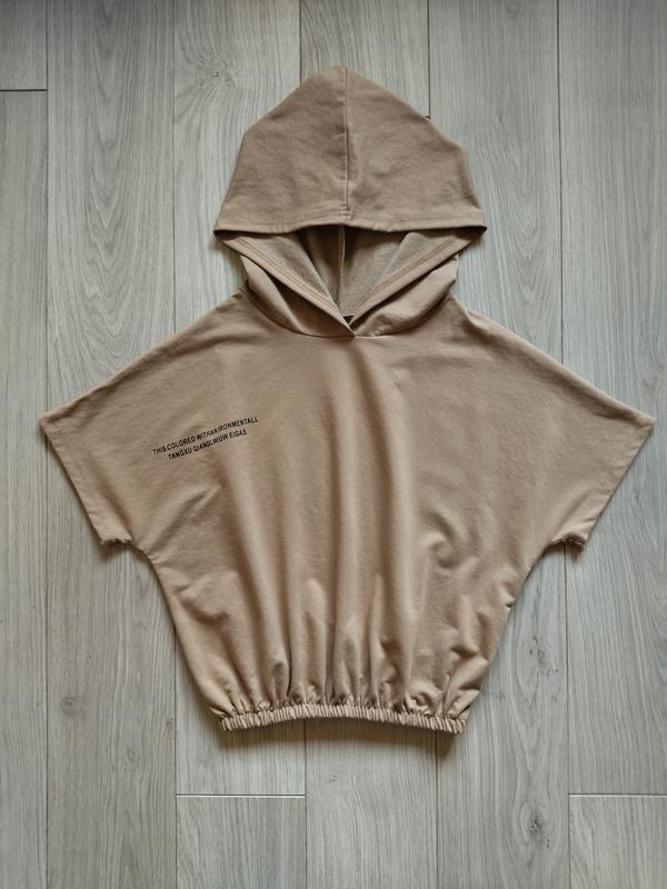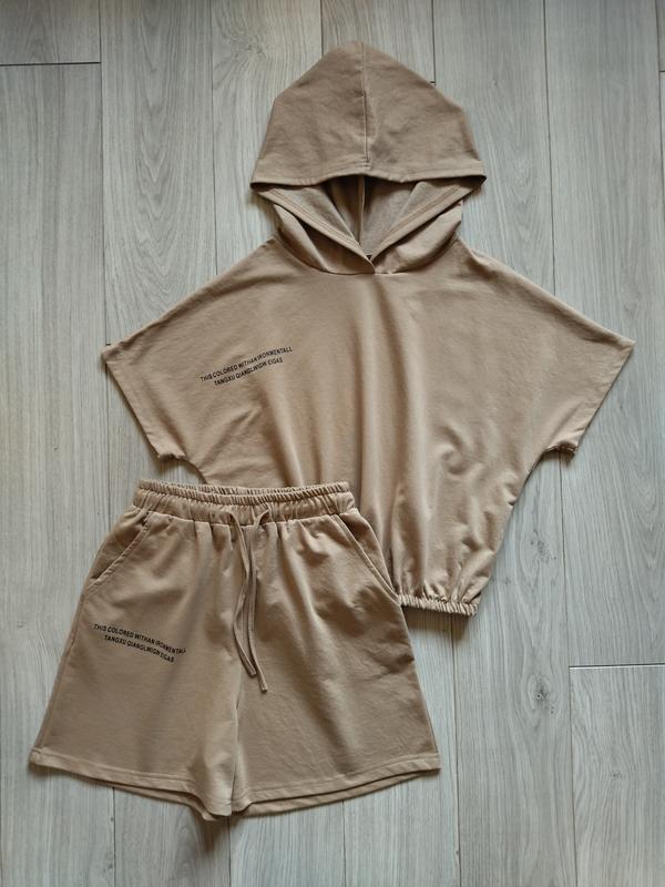 Футболочка вільного крою знизу на резинці. Шорти спереду з кишенями, пояс на резинці та шнурівці. Тканина трохи тягнеться, склад, на жаль, не вказано. Бірки з розміром немає, буде орієнтовно на 44-46 (S-M) розмір.