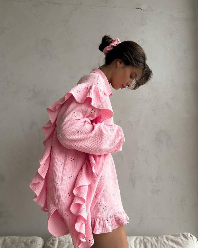 Мусліновий костюм сорочка оверсайз подовжена з рюшками на гудзиках шорти міні комплект бла...
