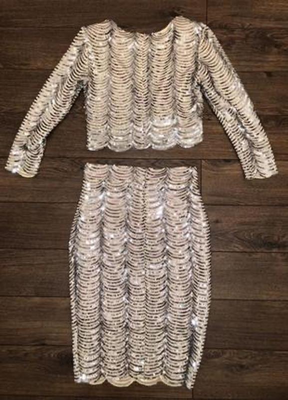 Костюм бежевого цвета, полностью вышит полосатыми паетками(92% полиэстера, 8% эластана, подкладка полиэстер). Основная ткань -тоненькая бежевая, стрейчевая, в обтяжку, а верхний слой - прозрачная сетка, полностью расшита пайетками, сетка тоже стрейчевая. Топ - на подплечниках. В жизни выглядит круче фото. Легкий. Длина топа 40см, ПОГ 44см-46см,ширина плеч 38см, длина рукава 51см,сзади потайная молния. Длина юбки 62см, ПОТ 34см-36см, сзади потайная молния, ПОБ 44см-46см, к низу заужена. Производство Великобритания.