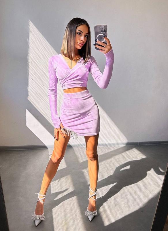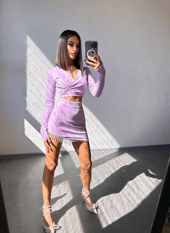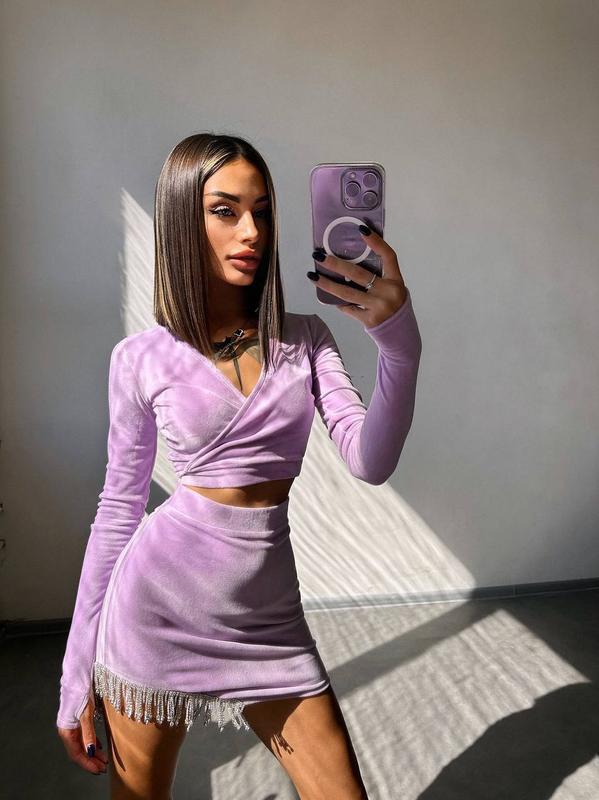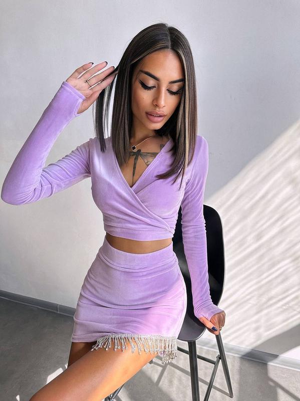 Ніжний оксамитовий комплект декорований бахромою зі страз, бархатний вечірній костюм з юбкою зі стразами