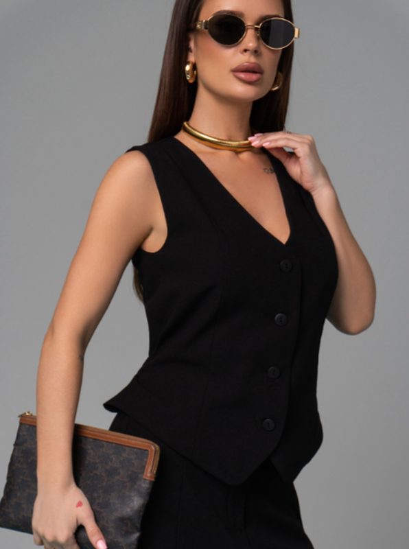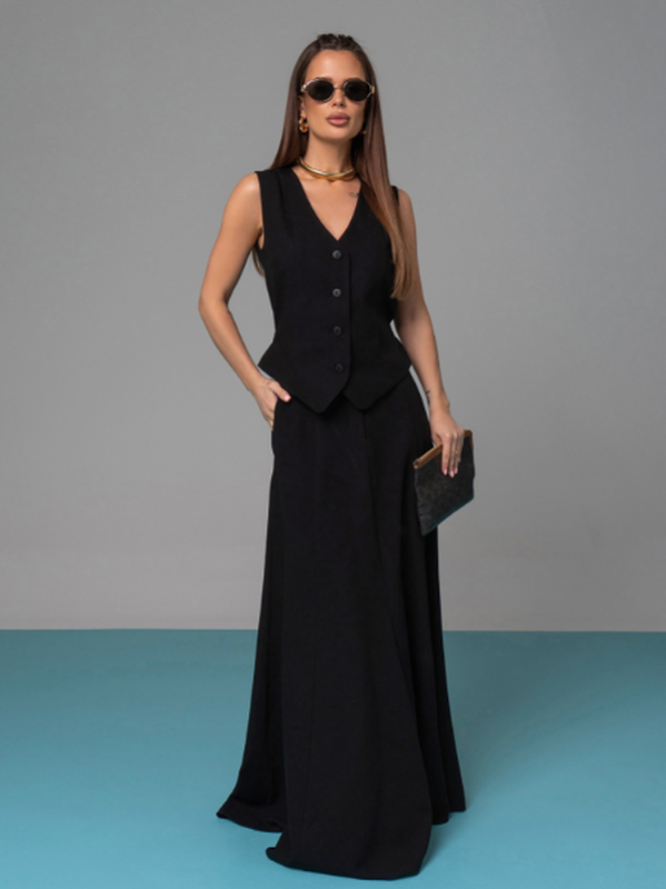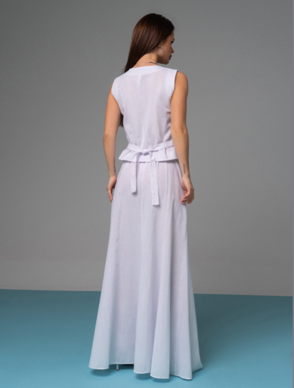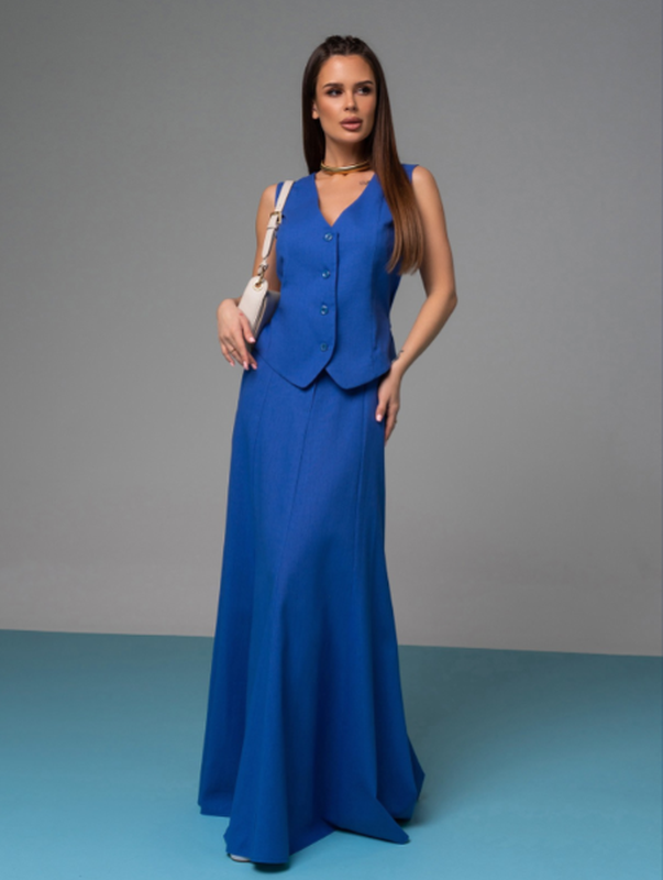 Лляний костюм із довгою спідницею кльош і жилетом. Жилет на ґудзиках без спідньої підкладки із зав'язкою ззаду. Жилет без рукавів з V-подібною горловиною. Спідниця на ґудзику та змійці оснащена гумкою ззаду на поясі та кишенями.
