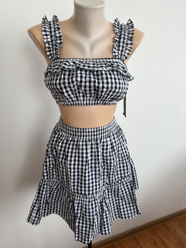 Костюм (спідниця топ) Хс/С (по замірам може бути і на М) натуральний котон дуже приємний та легкий на літо виглядає стильно буде супер і під кеди і під босоніжки колір синій з білим Топ к розмірі ХС (на резинках класно тягеться) Заміри: У спокійному стані 32 см за рахунок рещинок тягнеться аж до 50 см максимум Спідниця у розмірі С (пояс на резинці тягнеться) Півобхват талії - 32 см тягнеться аж до 46 см Півобхват бедра вільно
