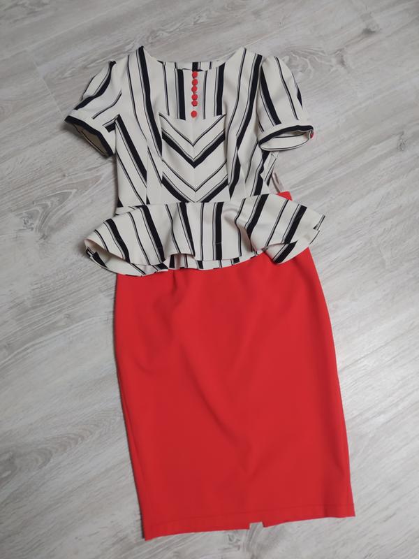 Жіночий елегантний костюм: стильна блузка з баскою та контрастним принтом у чорно-білу смужку, доповнена декоративними ґудзиками, у поєднанні з однотонною кораловою спідницею-олівцем Спідниця :ПОТ 38, ПОБ 44; Блуза: ПОГ41