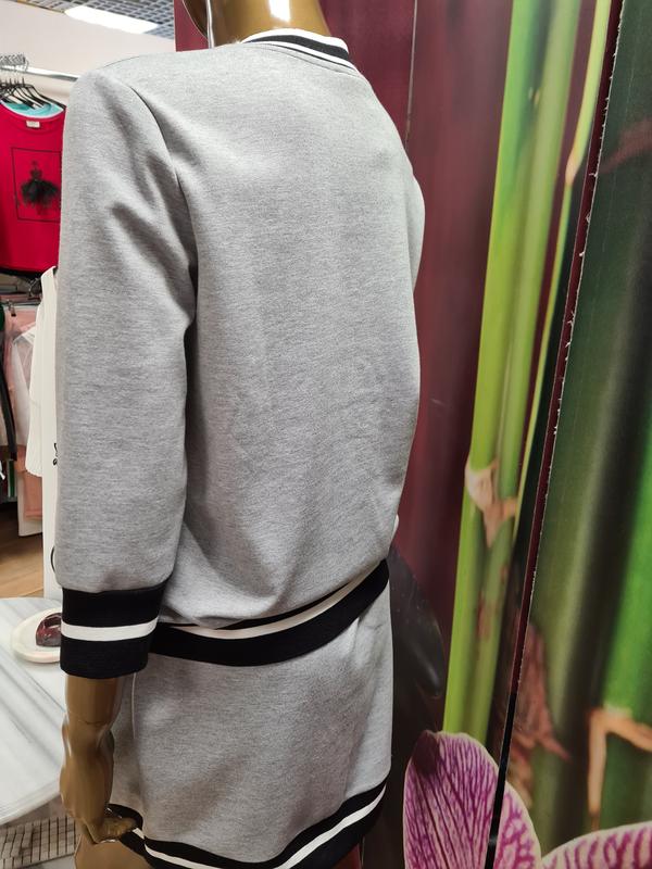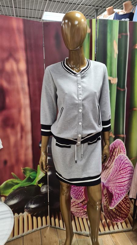 Стильний прогулянковий костюм виробництва Туреччина, фірма Sogo. Якість класу люкс. Кофточка йде у вигляді бомбера на кнопках. Також є імітація манжета: рукави, горловина і низ виробу. Рукав 3/4. Спідничка прямого крою, до коліна, з імітацією кишень. Спідниця не коротка, виглядає короткої через манжета. Тканина - трикотажний бавовна. Розмір S, M, большемерит, фактичний розмір 38-40, 40-42. Манекен 38 розміру. Розмір М Кофточка Об'єм грудей - 49,5 см Об'єм стегон - 40см без розтяжки, з розтяжкою 58сс Довжина по спині - 61см Спідничка Талія - 37см, куліска, манжет без розтяжки Об'єм стегон - 50см Довжина виробу - 42см В такій моделі Ви завжди будете виглядати привабливо і відчувати себе комфортно. Також дивіться інші моделі в моїй стрічці. Приємного перегляду ⚘ 🌼 🌺.
