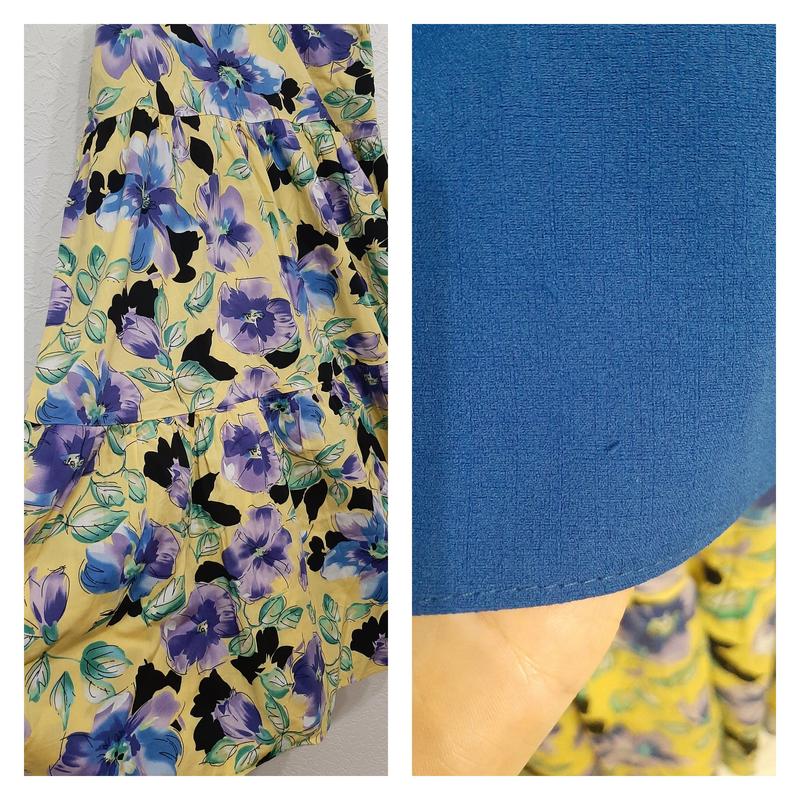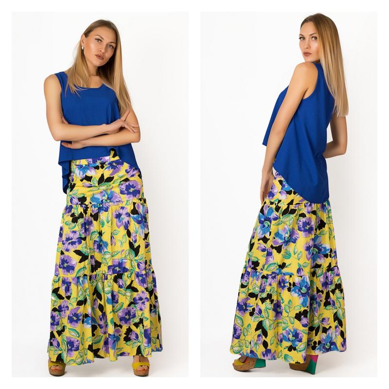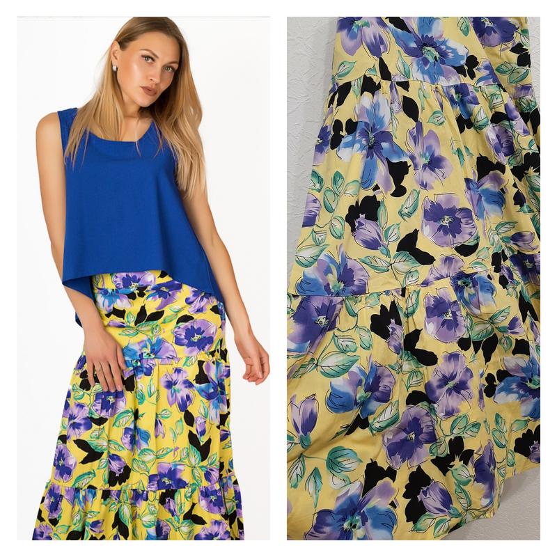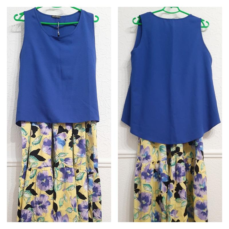 Ошатний літній костюм. Сонячна спідниця в квітковий принт і яскрава блузка синього кольору - чудове поєднання для гарного настрою . Костюм підійде на розмір 48 - 50 Блуза вільного крою, по спинці довше. Спідниця застібається на змійку. Дуже легкий ,не жаркий. Заміри за запитом. На останньому фото на блузці микроньюанс, він з виворітного боку. Склад: 60% поліамід 20% поліестер 20 еластан