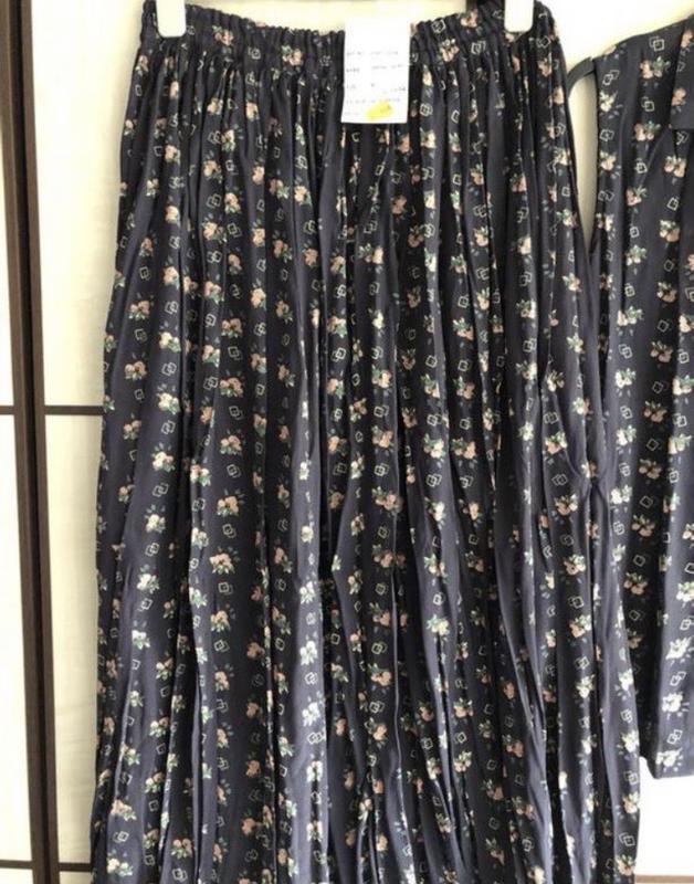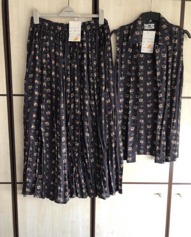 Костюм бренду No Spirit. Новий, з бірками. Віскоза 100/. Спідниця розміру М, довжина 95 см, по талії резинка 34 см і тягнеться до 50 см, блуза довжиною 74 см по спинці, по плечах 37 см, по грудях 43 см, по низу 52 і є розрізи. Колір графітовий з ніжним принтом