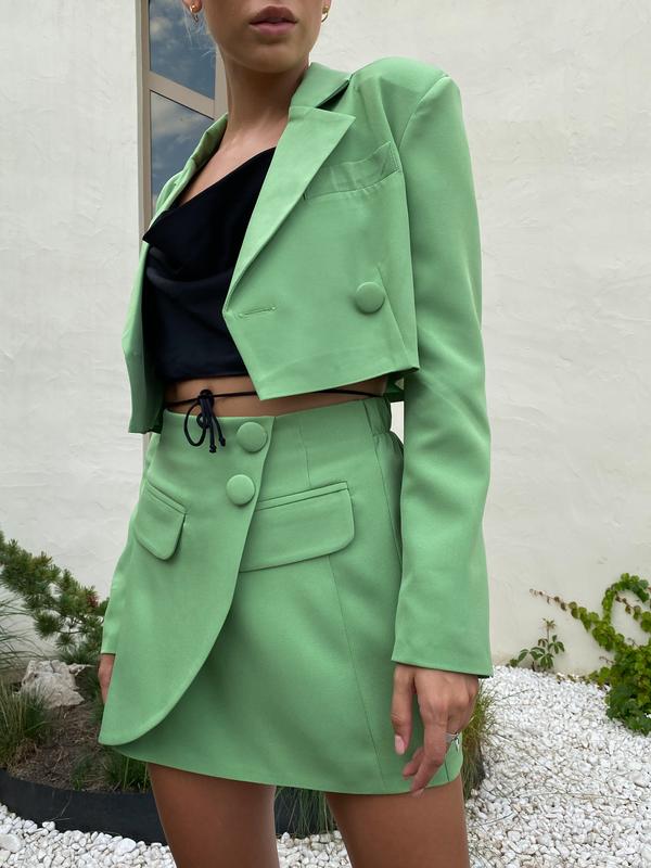 Актуальний Костюм двійка Кроп-жакет двобортний і спідниця з іміта запаху з невеликим розрізом Розмір : s, m Тканина :костюмка МПодкладка : бавовна В наявності є різні кольори