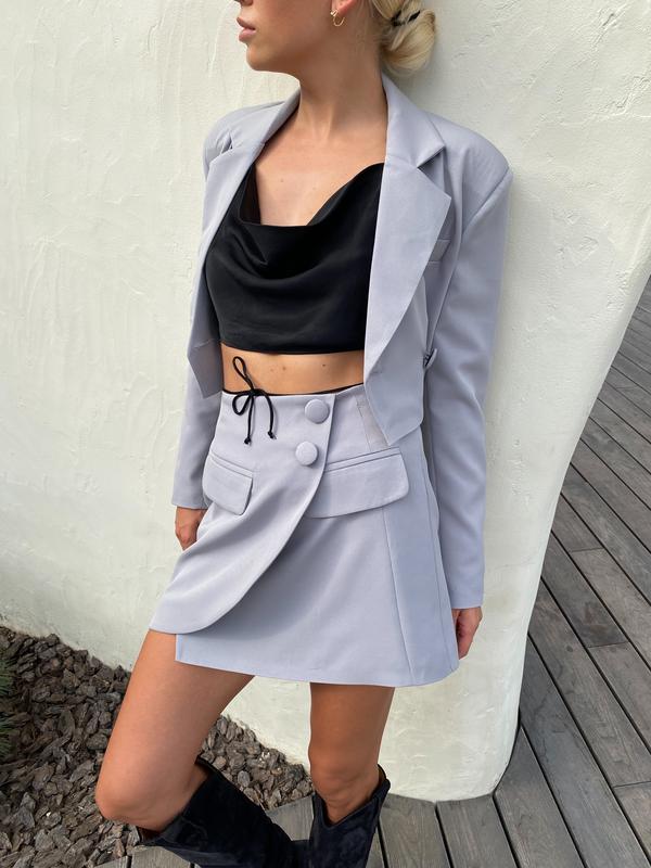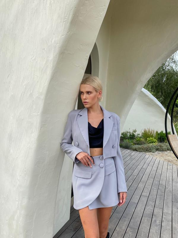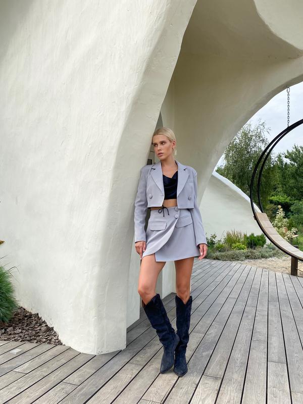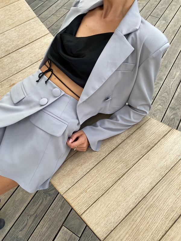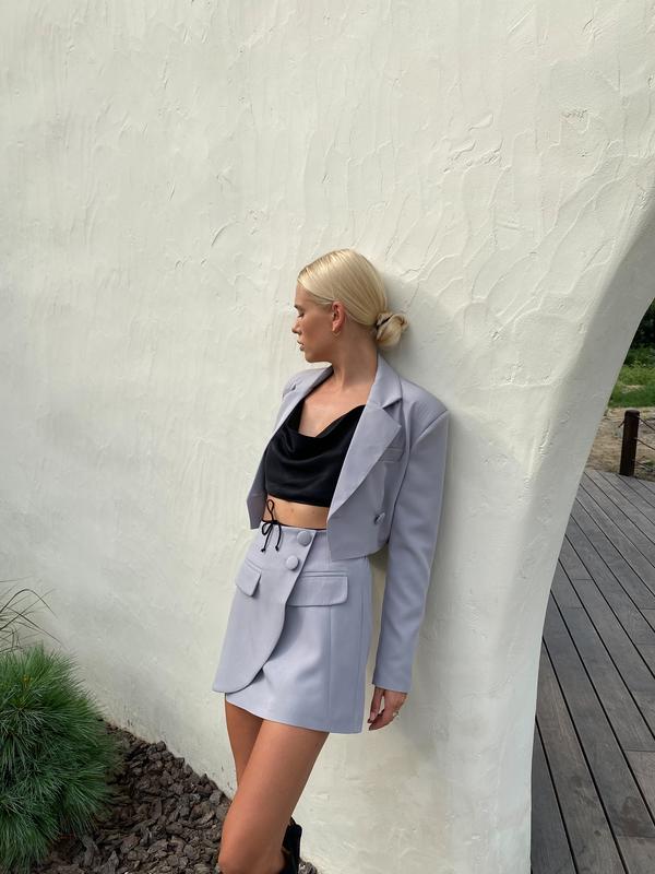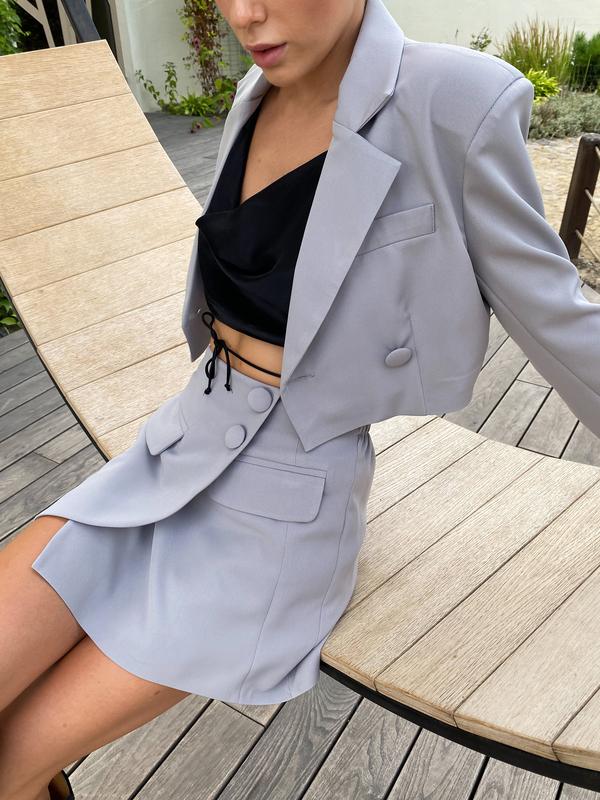 Актуальний Костюм двійка Кроп-жакет двобортний і спідниця з іміта запаху з невеликим розрізом Розмір : s, m Тканина :костюмка МПодкладка : бавовна В наявності є різні кольори
