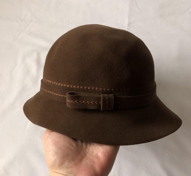 Шляпка Lady Like. Стан идеален. Ретро. Оттенок шоколада. Благородно-оксамитова фактура Миниатюрная, компактная. РАЗМЕР окружностью внутри 54.5 см Высота тулии 10 см Ширина полей 5 см Стан идеален. Эффекты отсутствуют Следы использования отсутствуют.