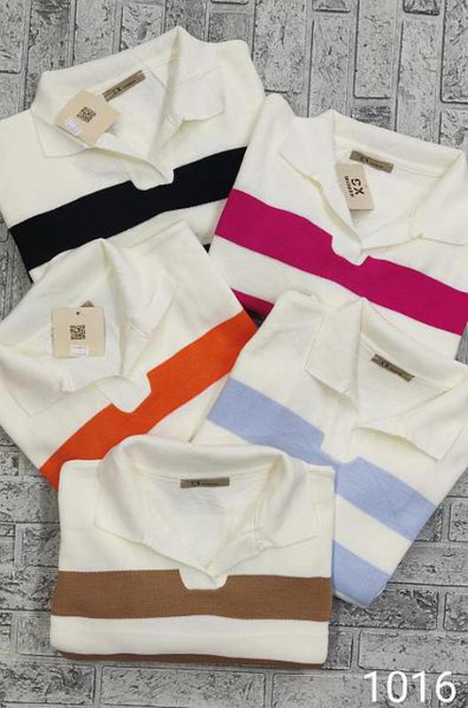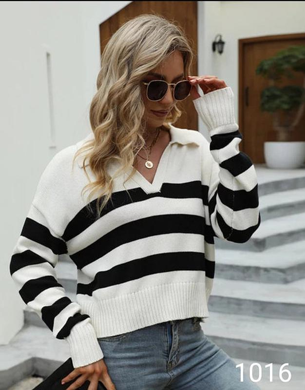 Универсальный женский джемпер в широкую полоску. Выполнен из мелкой и мягкой вязки средней плотности и эластичности. Треугольная горловина с отложным воротником. Длинный рукава и укороченный крой.