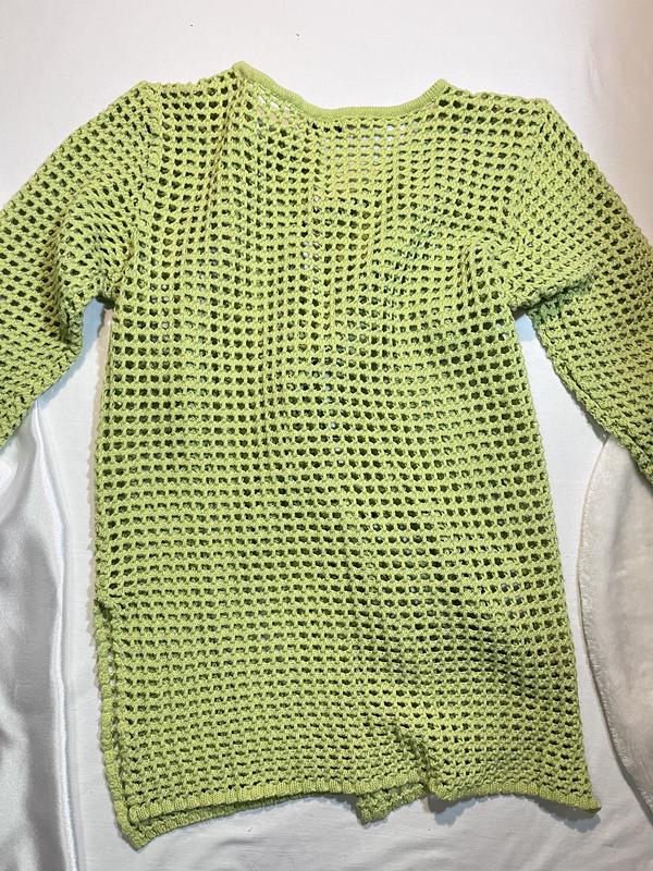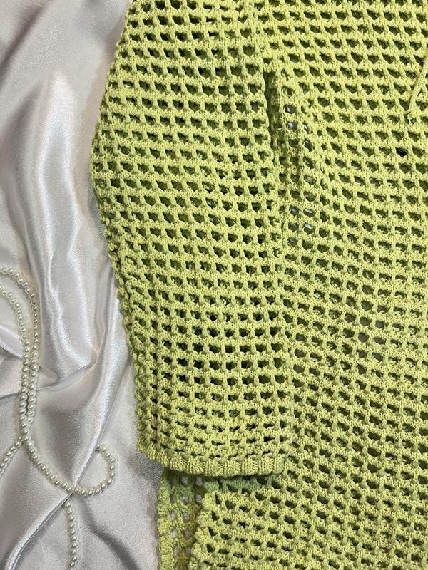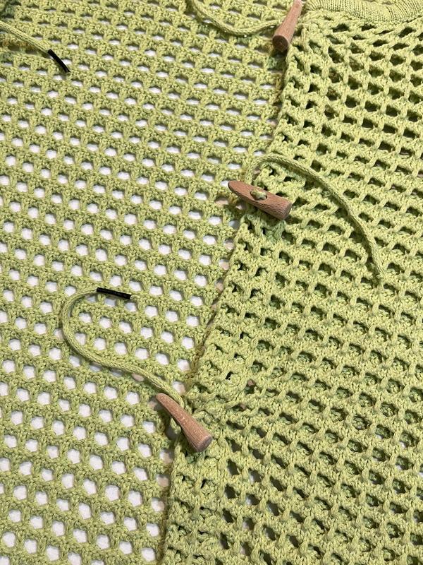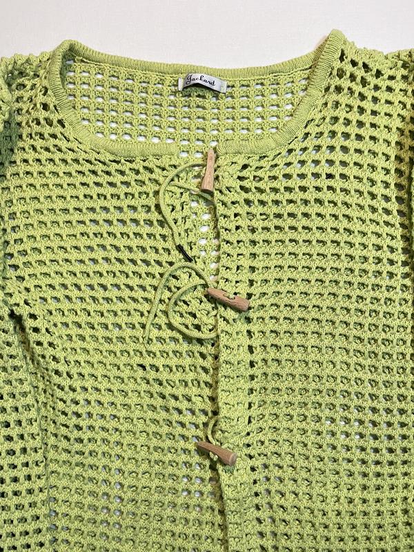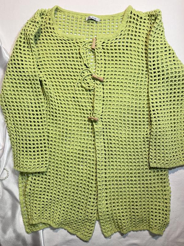 Зелена вʼязана кофтинка. Пастельный цвет, приятный материал, красивый как накидка. Завязки с элементами дерева.
