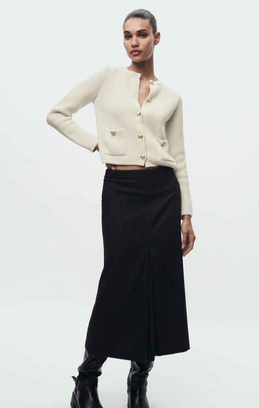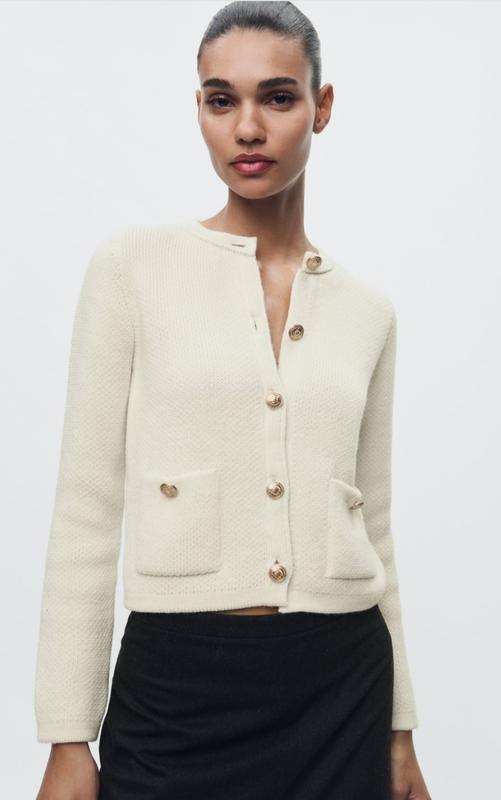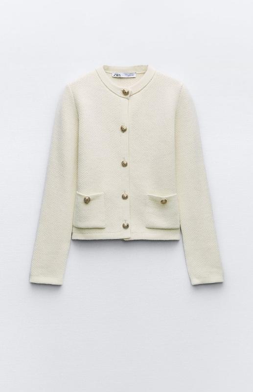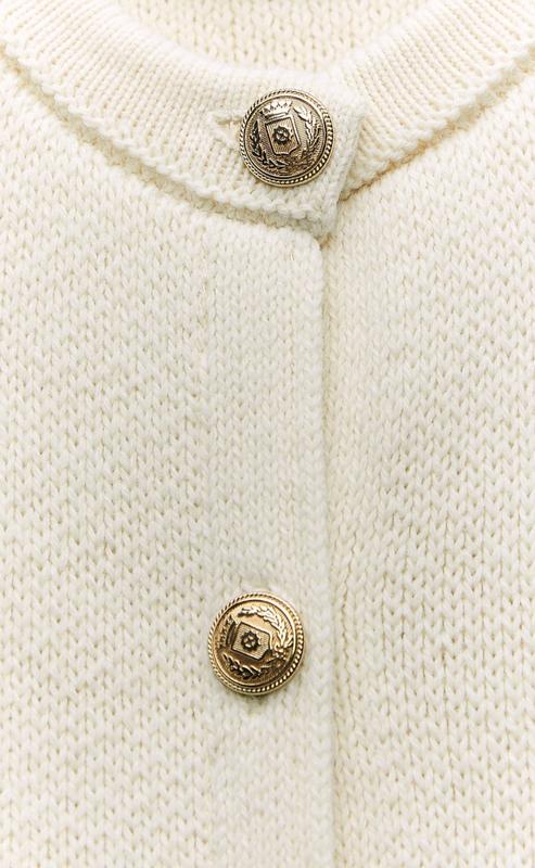 Жакет с круглым воротником и длинными рукавами. Застегивается на рельефные золотистые пуговицы спереди. Накладные карманы спереди