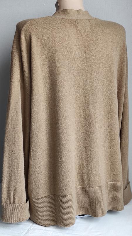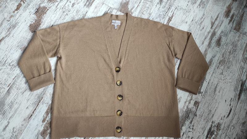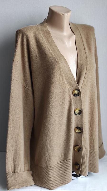 Дуже красивий кашеміровий кардиган. Стан ідеальний. Справжній колір видно на перших трьох фото, бо на фото вживу камера його не передає. Оверсайз, розмір S. Заміри: довжина від коміру по центру спинки - 71 см; ширина в плечах - 72 см; довжина рукава - 52 см (манжета широка, можна підвернути); НОГ - 71 см; НО низу - 71 см. Додаткові фото та заміри надам за потреби. Дивіться інші мої оголошення.