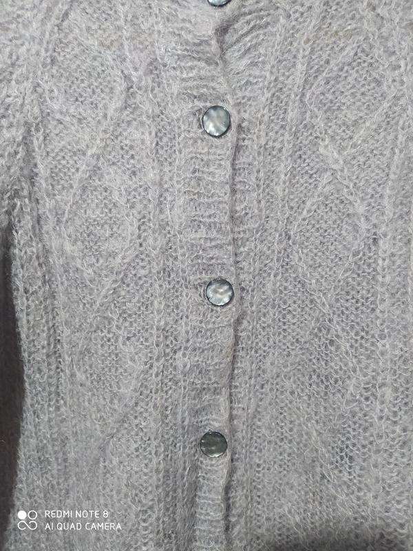 Ручна робота.Бірки немає, але це мохер 100%.Кофта зв'язана з тонкої теплої пухнастої натуральної нитки.Легка, як хмаринка, але тепла!