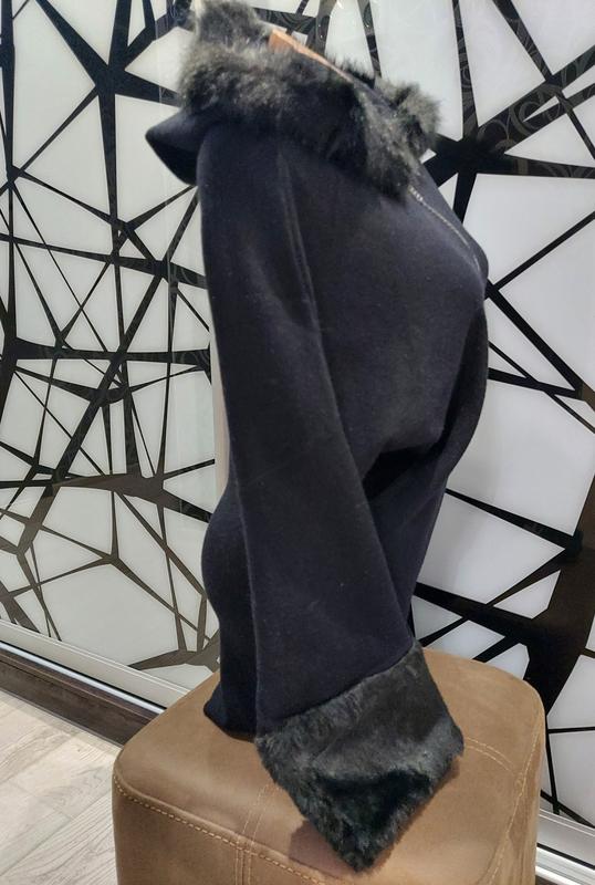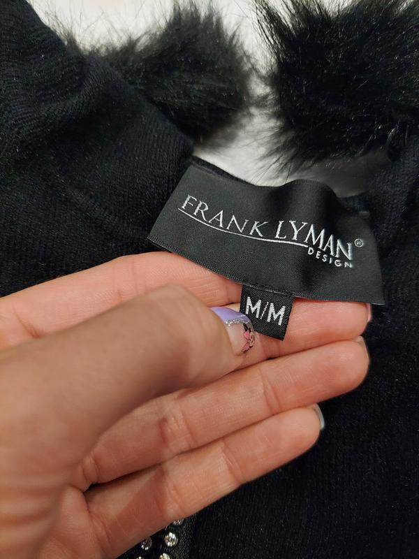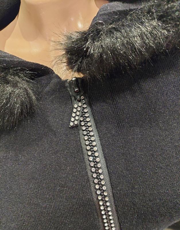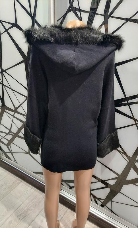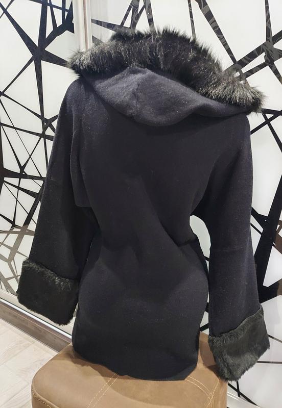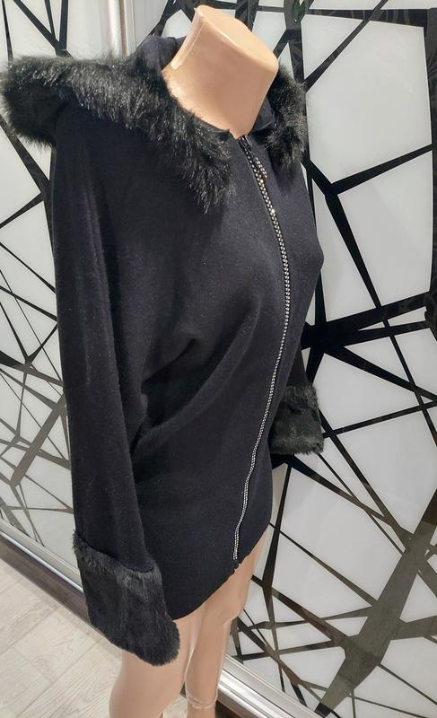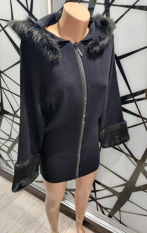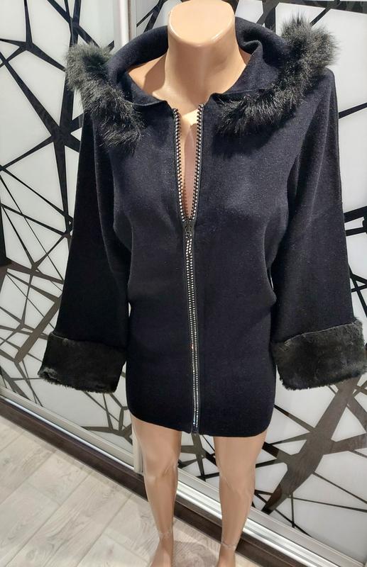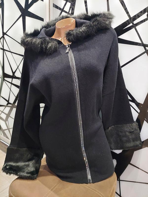Женственный кардиган, трикотажное пальто с капюшоном и опушкой черного цвета с меховыми вставками на молнии от Frank Lyman. Состояние идеальное, без дефектов, затяжек, дыр, пятен, катышек и прочего нет. Молния со стразами. Опушка с капюшона снимается, пристегивается на пуговицы. На бирке указан размер М, подойдет на 44-46. Ткань хорошо тянется. На теле смотрится женственно и очень стройнит. Ткань 56% район, 26% нейлон, 18% полиестер. Замеры предоставлю по запрому. На манжетах искуственный гладкий мех отличного качества.
