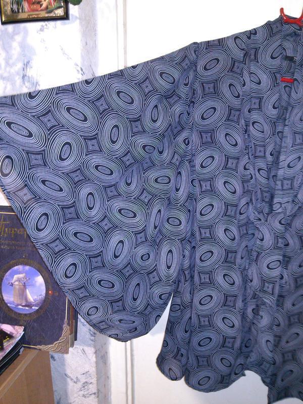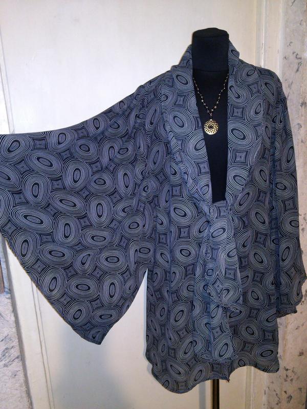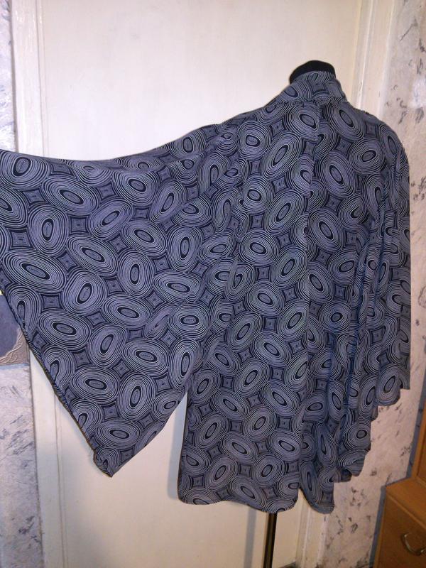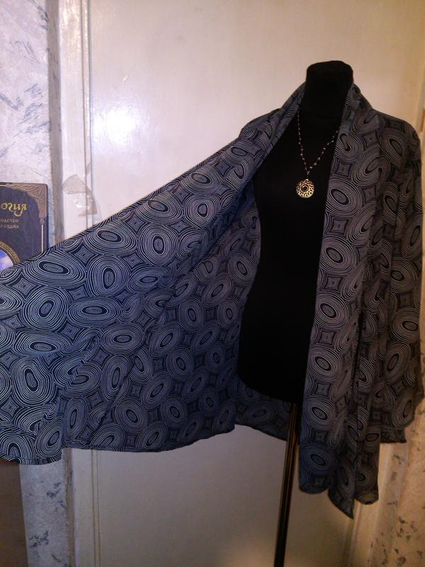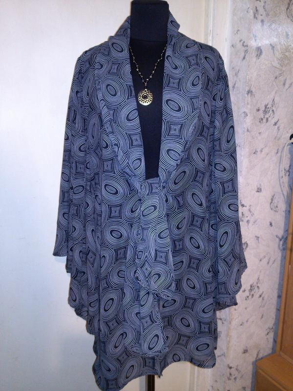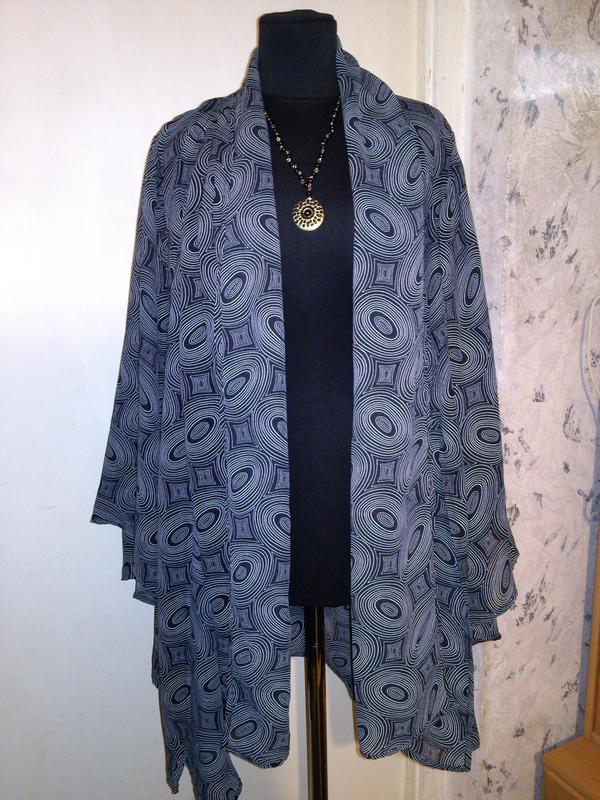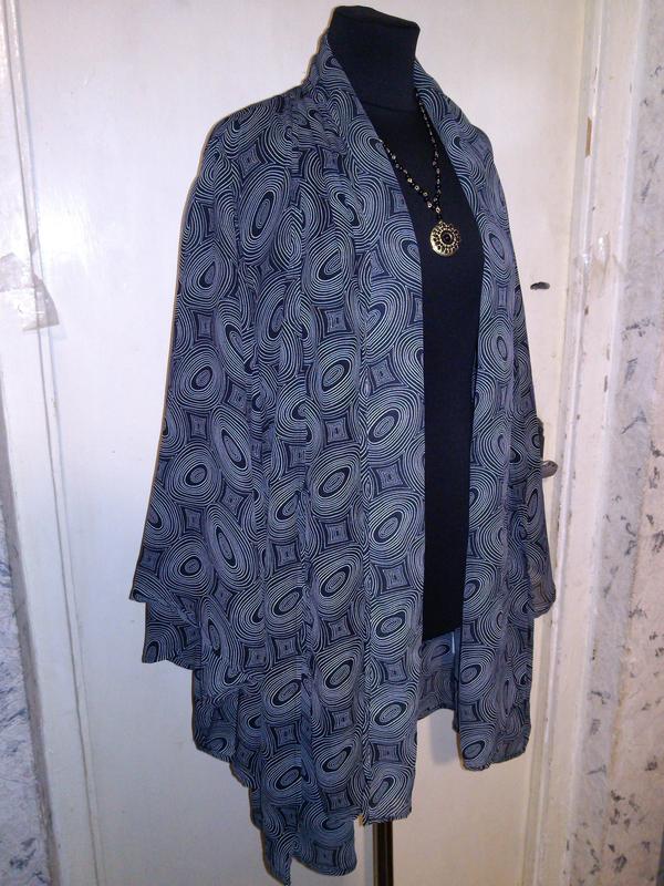 Эффектный,женственный,кардиган-разлетайка-болеро,с широким рукавом-типа кимоно,большого размера,оверсайз,NP. Бирка с размером и составом срезана. Одевала на размер 56-58,бёдра 136см,вещь свободная-завязывается на "галстучек", скрывает всё,что нужно скрыть. Прекрасно подойдёт на "выход". Мерки снять сложно,но ориентируйтесь по условным замерам,снятым по спинке: длина по спинке - 77см, длина рукава - 50см, ПО ширины рукава по канту - 65см; ПО проймы по шву - 41 см; ПОГ -по спинке ,от подмышки до подмышки -53см - учитывайте,что пройма большая в связи с кроем рукава; ПОБ,по канту спинки - 80см,передняя полочка по канту - 42см