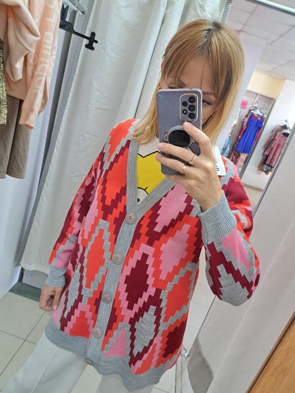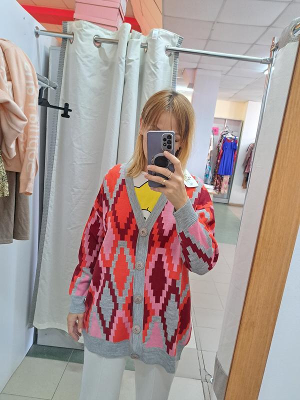 Качественный, шерстяной (теплый), мягкий кардиган. Яркая, удлиненная модель.Чудово носиться. До 52рОтлично с удлиненными рубашками, лосинами и просто на прохладные ранки