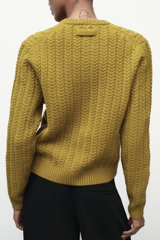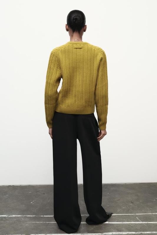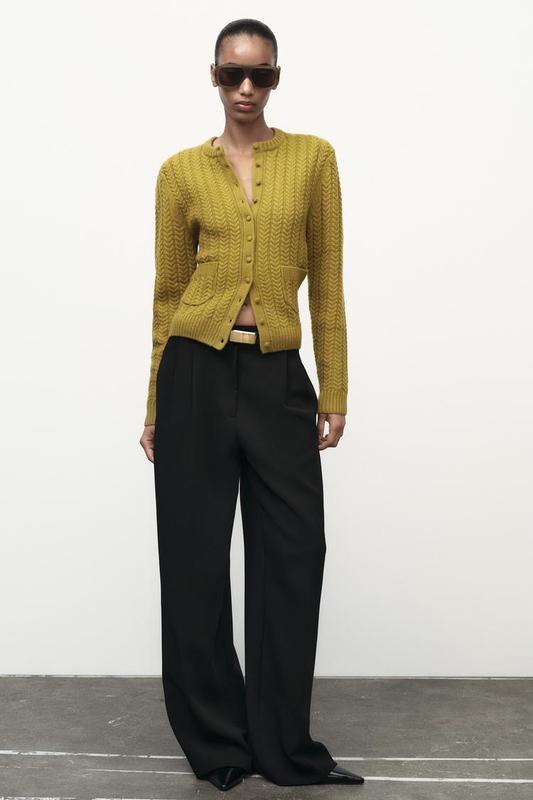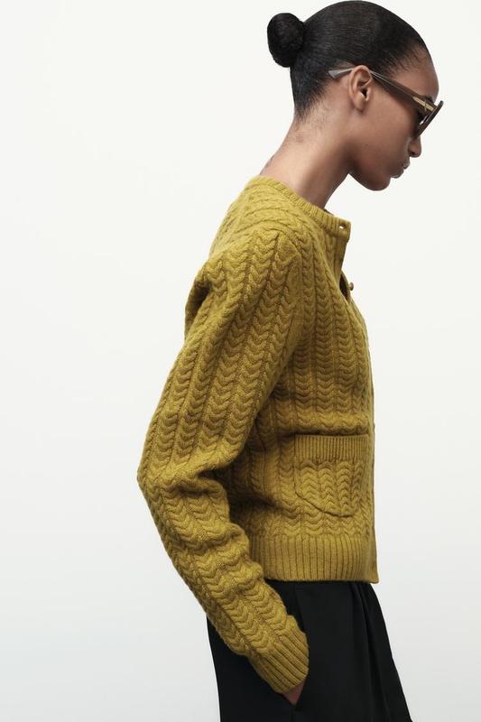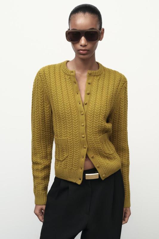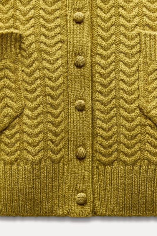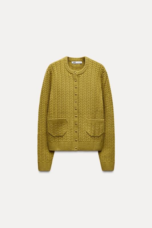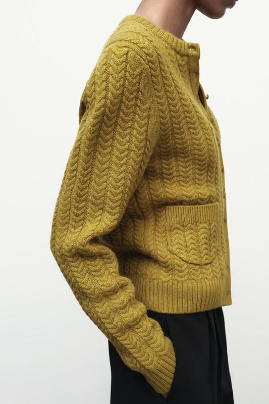 Кардиган из 100% шерсти. С круглым воротником и длинными рукавами. Накладные карманы спереди. Застегивается на обшитые пуговицы спереди. Окантовка в рубчик по краям.